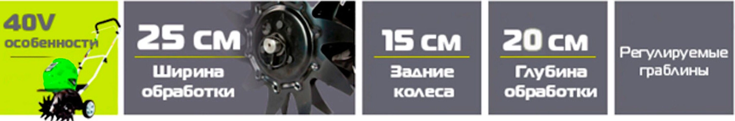 - Работа от 40V аккумулятора совместимого с другими устройствами из линейки G-MAX 40V