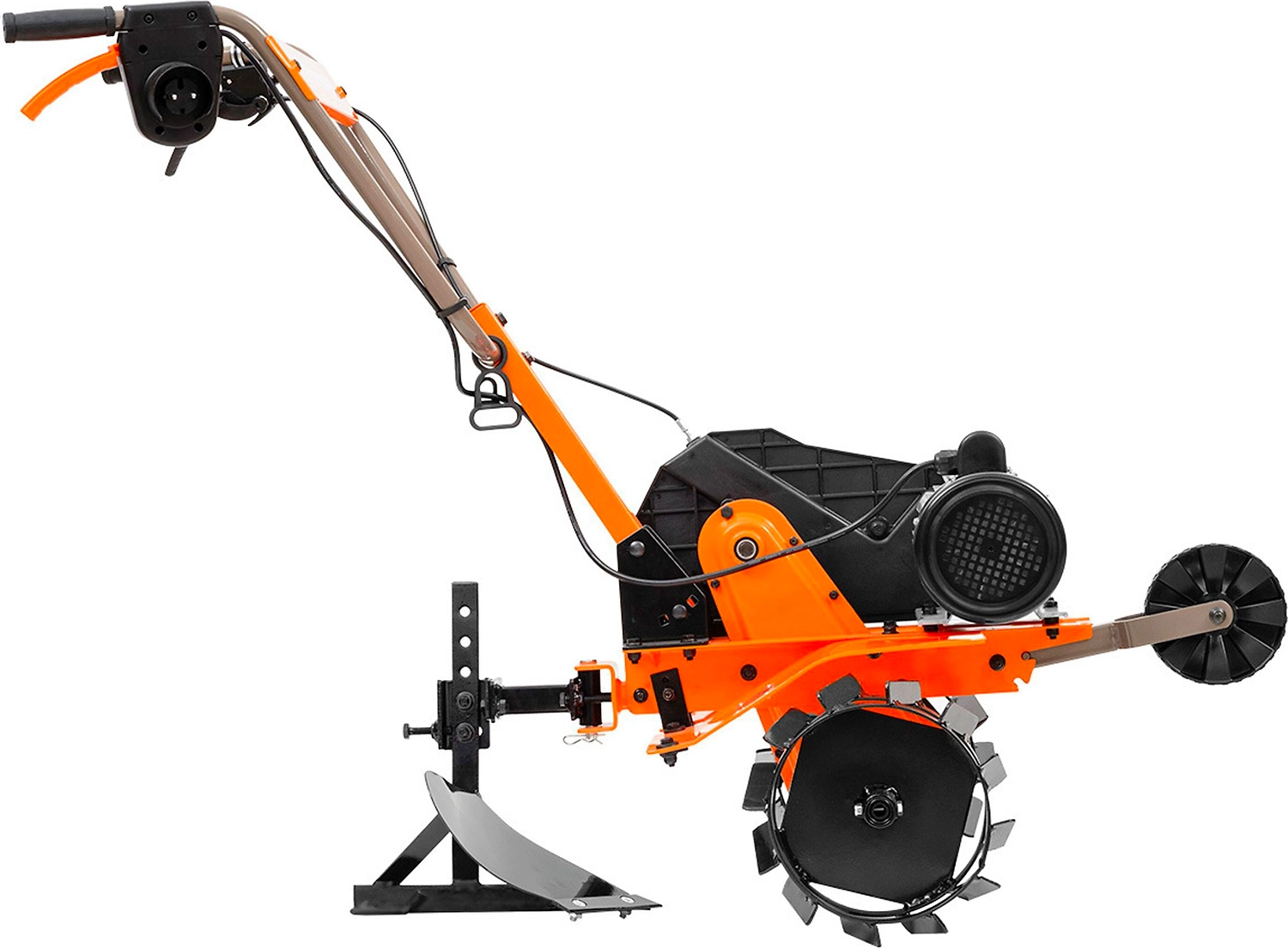 - Усиленный сошник отвечает за глубину вспашки и простоту эксплуатации, надежно зафиксирован на раме культиватора.