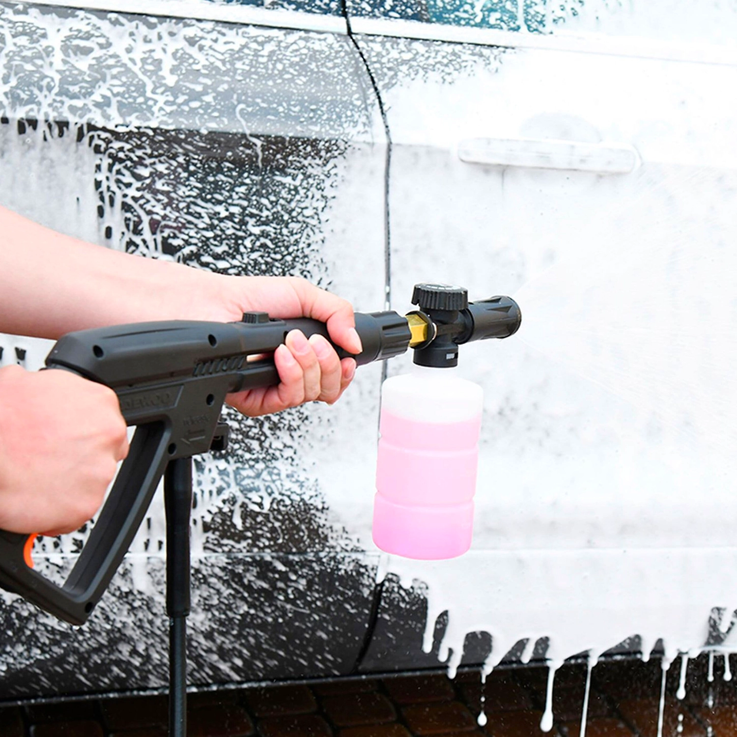 - Подключается в качестве насадки на пистолет, входящий в комплект мойки высокого давления