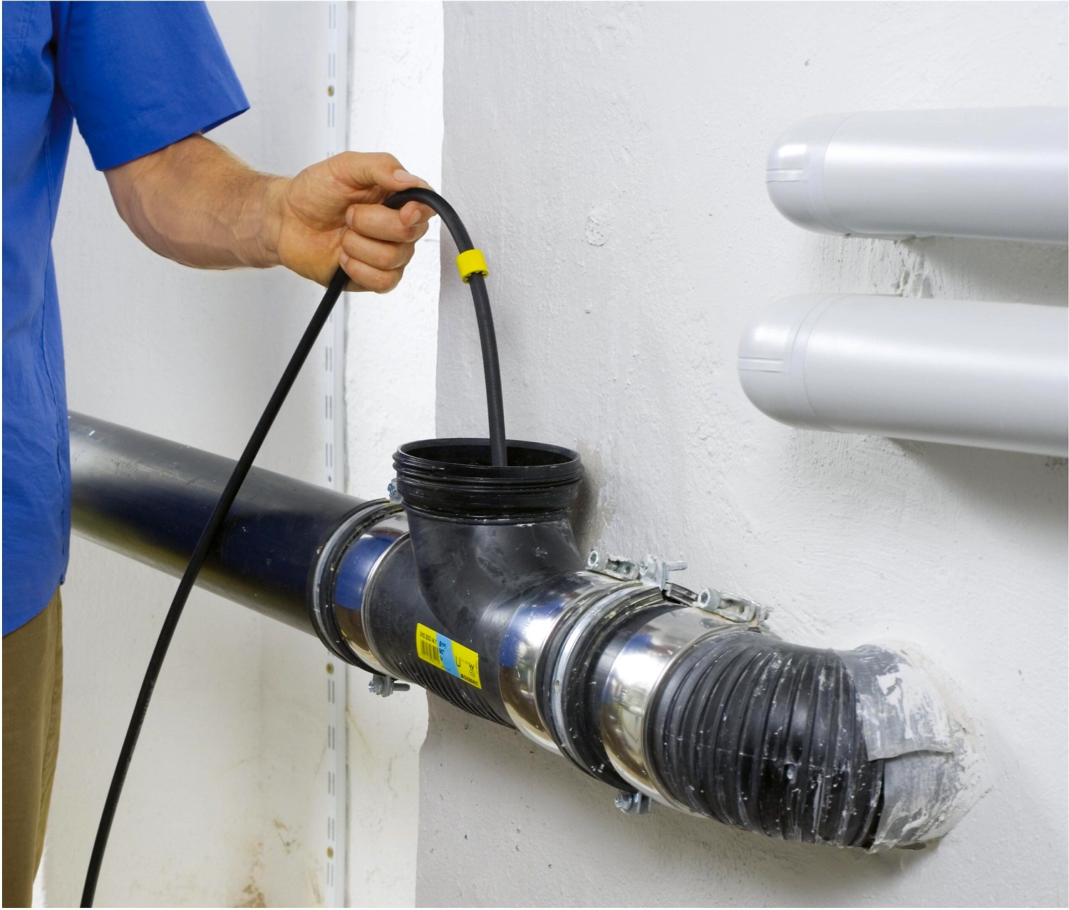 Комплект для промывки труб позволяет прочищать засорившиеся трубы и стоки. Четыре направленные назад струи высокого давления обеспечивают продвижение шланга по трубе и удаление грязи.