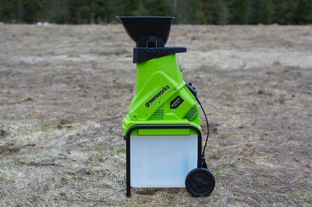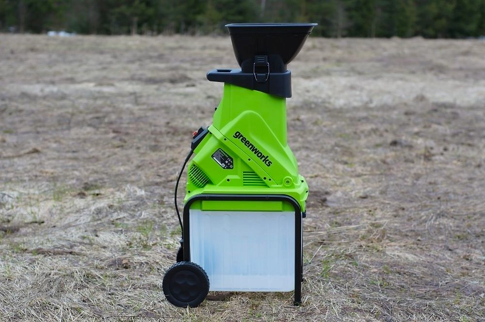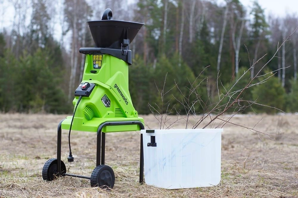 Измельчитель садовый электрический Greenworks GACSB, 2500 Вт с контейнером предназначен для утилизации растительных отходов, например, веток, стеблей (кроме травы).