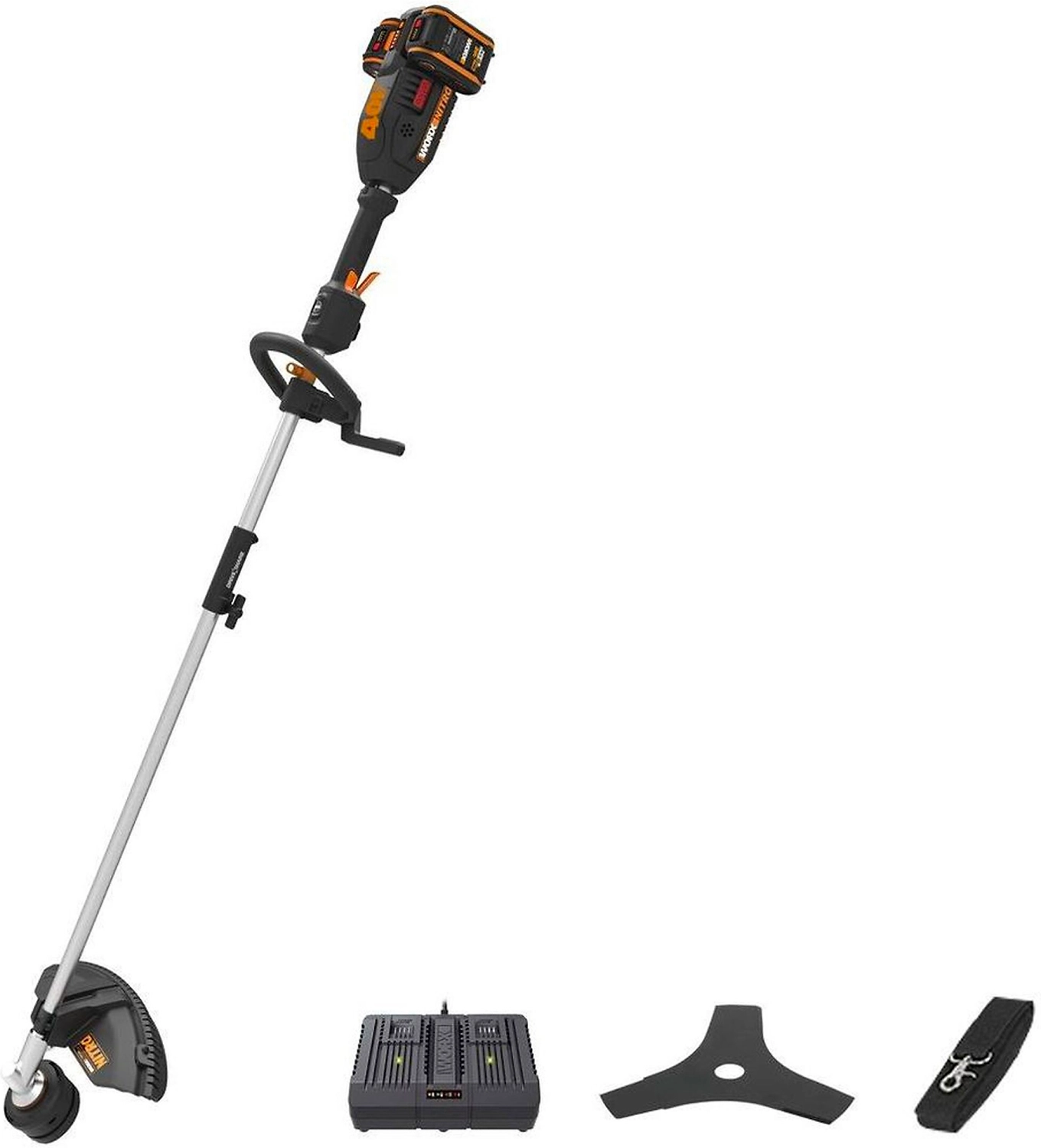 Аккумуляторный триммер WORX WG186E.1, работающий от двух аккумуляторов 20В. Command Feed - Автоматическое удлинение лески.