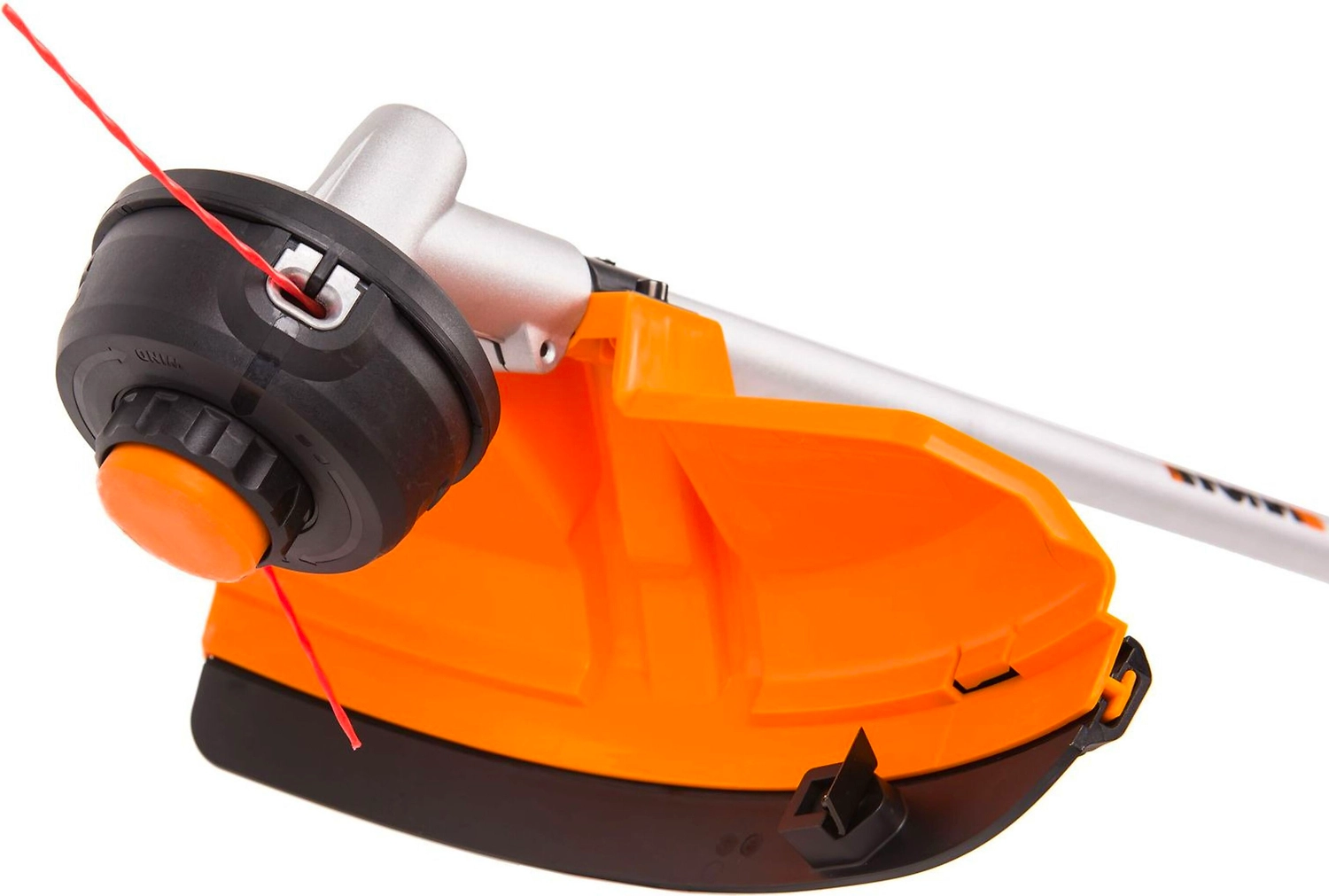 Триммер WORX WG186E.9 может работать не только с леской, но и с режущим диском или ножом, что позволят стричь густую траву или молодые побеги кустовых пород. Ширина покоса составляет 33см. Режущий механизм WG186E.9 дополнен ограничителем, который предотвратит повреждение декоративной растительности при покосе. Регулировка скорости и мощности вращения помогут выбрать точный режим для стрижки растительности. Система автоматического удлинения лески Command Feed значительно упрощает и ускоряет рабочий процесс. Для выпуска лески нет необходимости останавливать двигатель, достаточно просто нажать клавишу на приводной рукоятке. Конструкция с прямым валом удобна в работе и позволяет обрабатывать труднодоступные участки.