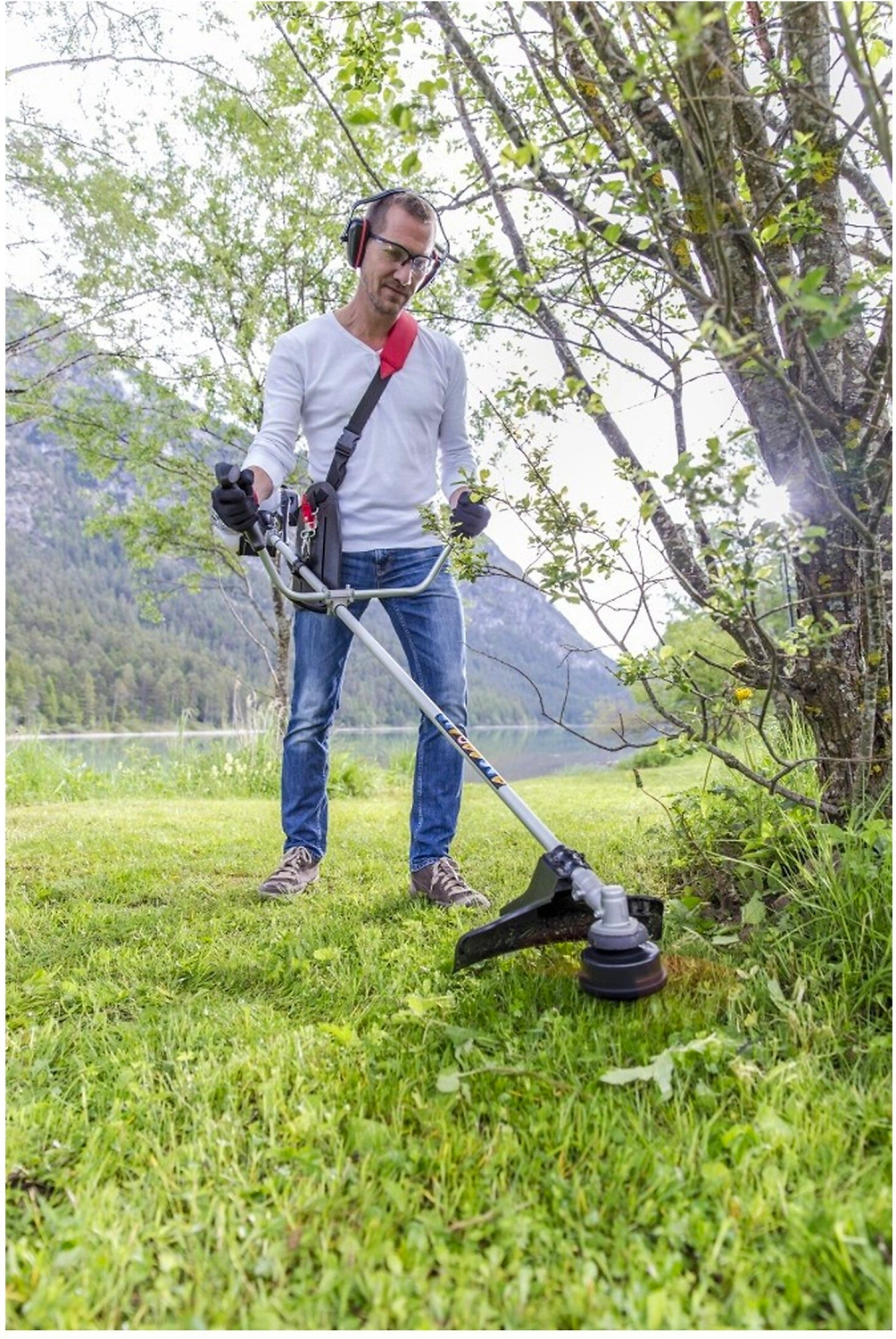 - Ручка в форме велосипедного руля и плечевой ремень с защитой тазобедренного сустава оптимально распределяют нагрузку на оператора для безопасной и неутомительной работы.