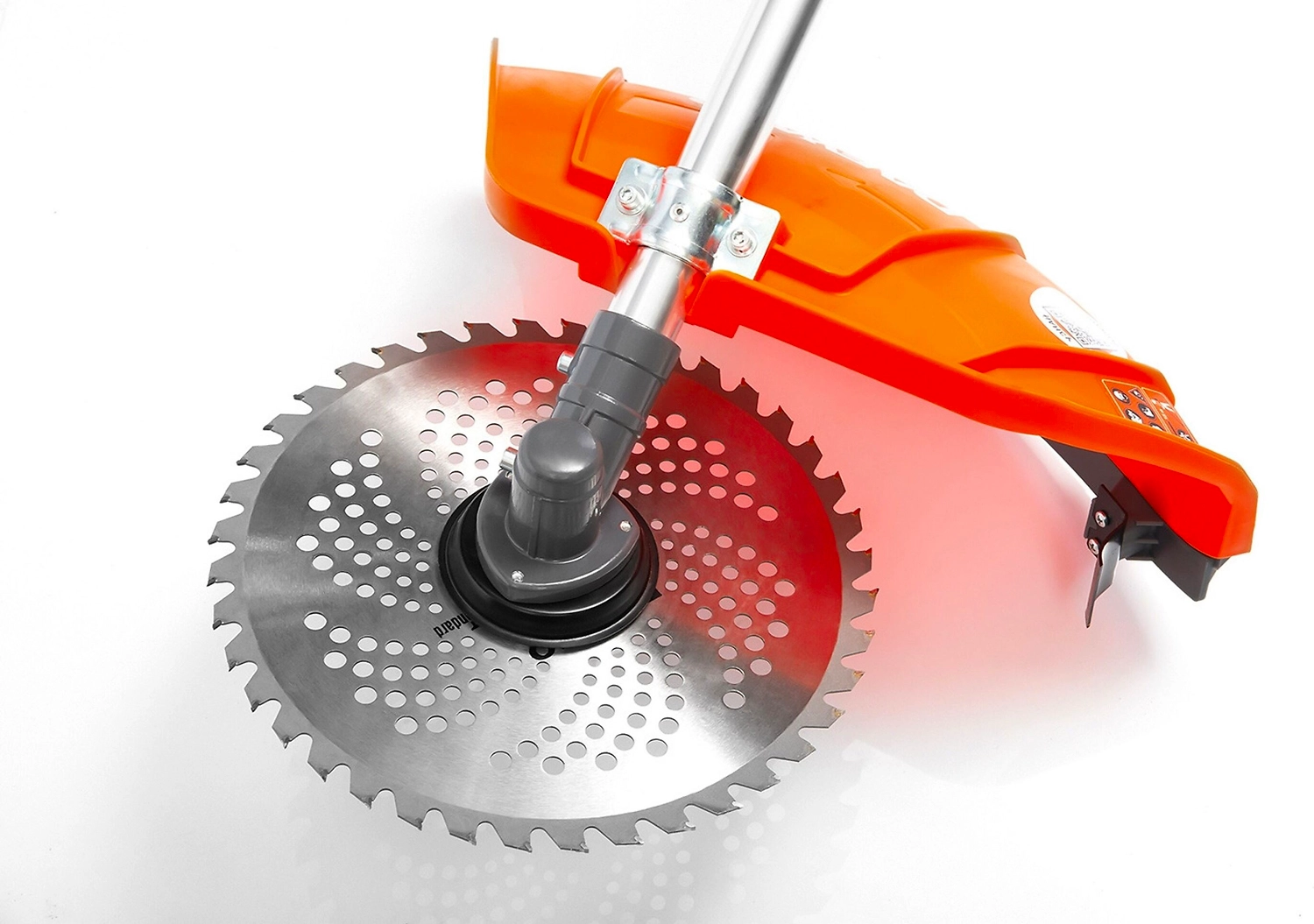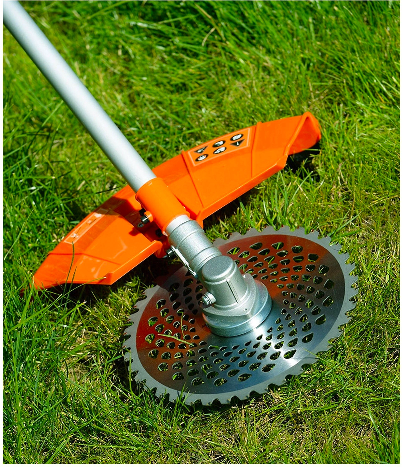 - Прочный стальной диск с твердосплавными напайками эффективно срезает жесткую траву, кустарник и тонкие стволы деревьев.