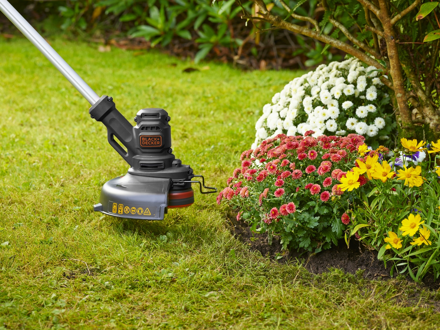 Головка поворачивается на 180 градусов, что позволяет подстригать траву вокруг цветов или кустарников, не повреждая их.