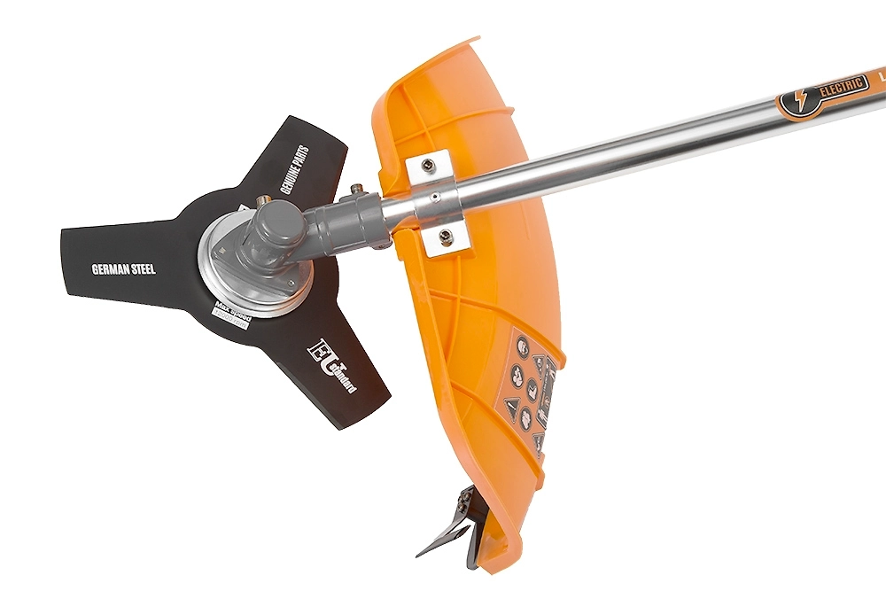 - При попадании твердых предметов в режущий механизм ударопрочный защитный кожух убережет пользователя от травм, а инструмент от поломки.