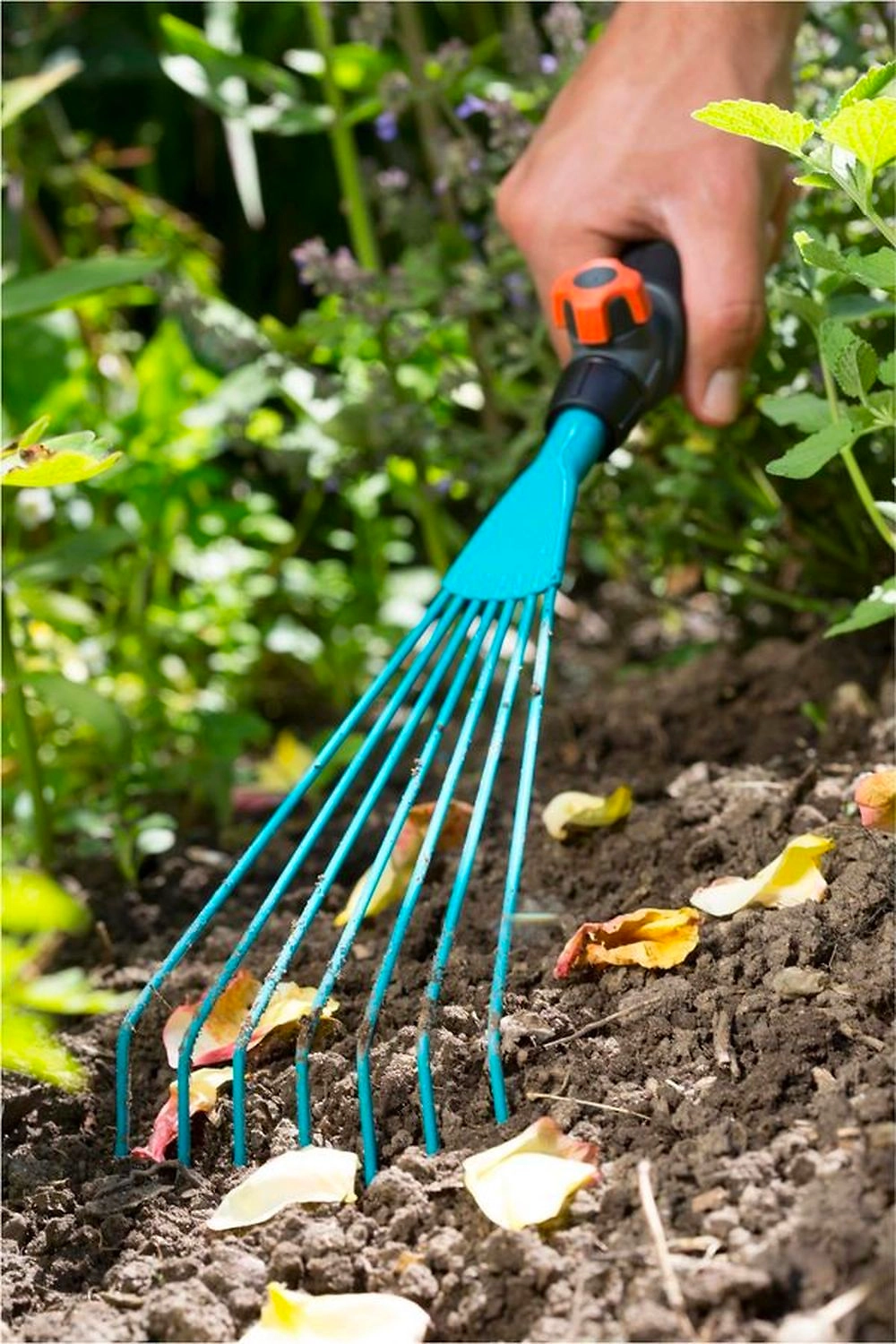 Грабли - Gardena 08917 с металлическими подпружиненными зубьями. Рабочая ширина 12 см / 7 зубьев.