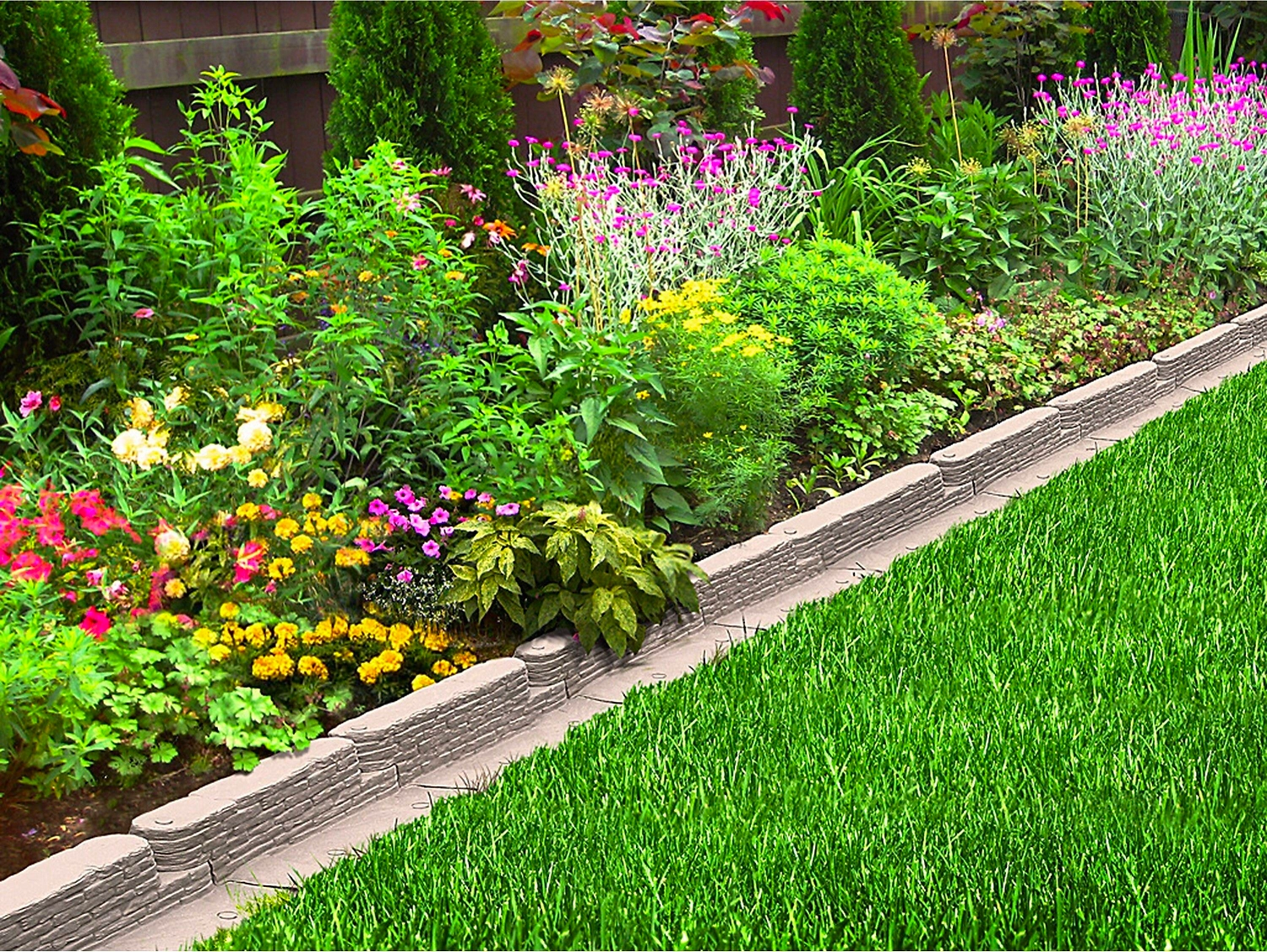 Стильный бордюр, имитирующий каменную кладку, поможет красиво оформить садовые дорожки, клумбы, зонировать территорию.