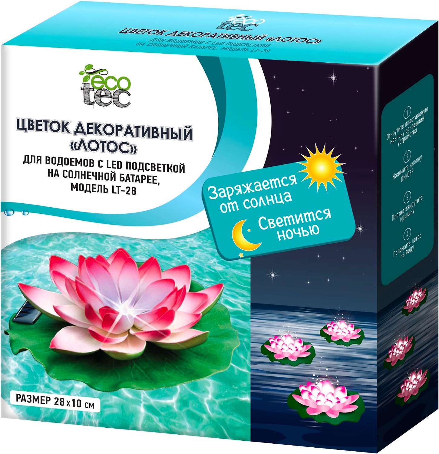 Используется в прудах, бассейнах, фонтанах и прочих водоемах. Изделие имеет LED подсветку, которая заряжается днем от солнечного света и светится ночью. Мерцающая LED подсветка позволяет любоваться прудом в темное время суток, создавая волшебную атмосферу. Цветок не требует подключения к внешним источникам питания и может размещаться в любой точке пруда. Долговечное светодиодное освещение не требует замены в течение срока службы. Изделие полностью безопасно для всех обитателей водоемов. Размер 28х10 см.