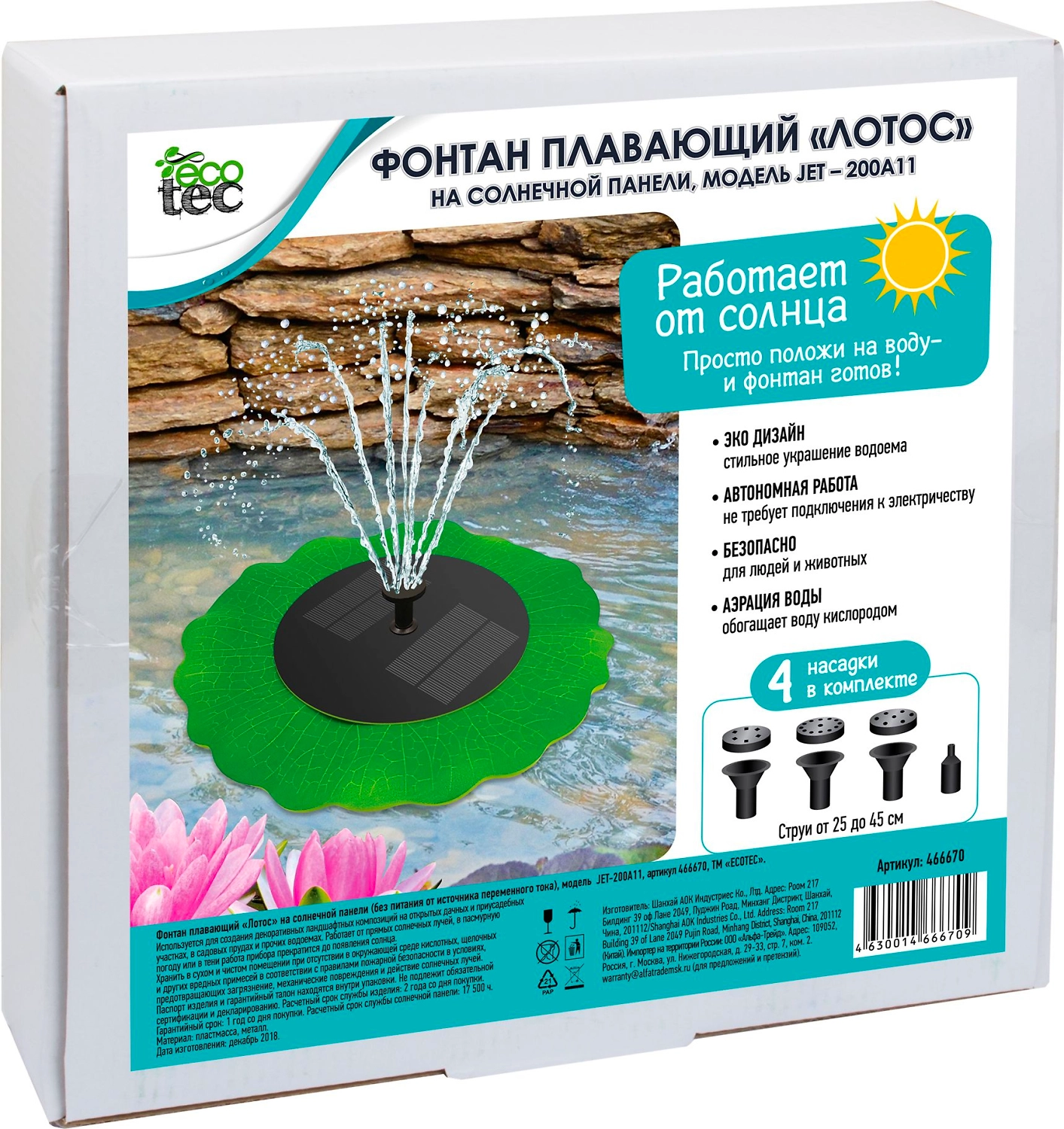Декоративный фонтан плавающего типа в виде большого зеленого листа водяного растения. Работает полностью автономно, заряжаясь от солнечной батареи, разработанной с использованием современных технологий. В комплекте четыре насадки с разной конфигурацией отверстий для воды, которые позволяют создавать различные варианты струй фонтана. Фонтан выполняет не только декоративную, но и практическую функцию, предотвращая застаивание воды.