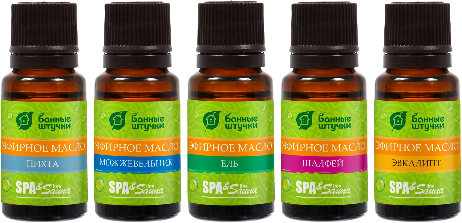 Эфирные масла применяются в бане, сауне или добавляются в горячую ванну. Всего несколько капель распространяют приятный аромат, который будет способствовать комфортному расслаблению и созданию умиротворяющей атмосферы. В наборе пять разных ароматов - эвкалипт, ель, шалфей, пихта и можжевельник, каждый из которых обладает своими лечебными свойствами и воздействием на организм.