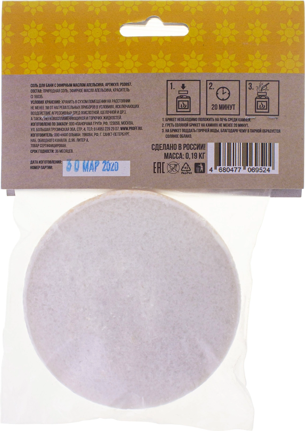 Положите соль на камни и полейте водой. В результате образуется облако соляного пара, а по всей парилке разносится приятный аромат. Состав: чистая структурированная соль, эфирное масло.