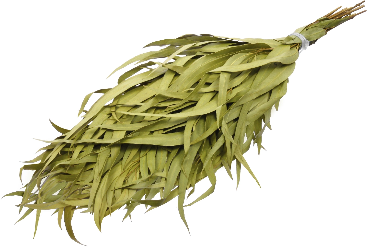 Эвкалиптовый веник обладает характерным ароматом. Он обеззараживает помещение, обладает мощным противомикробным действием, эффективен для профилактики простудных заболеваний. Размер: 48-53 см.