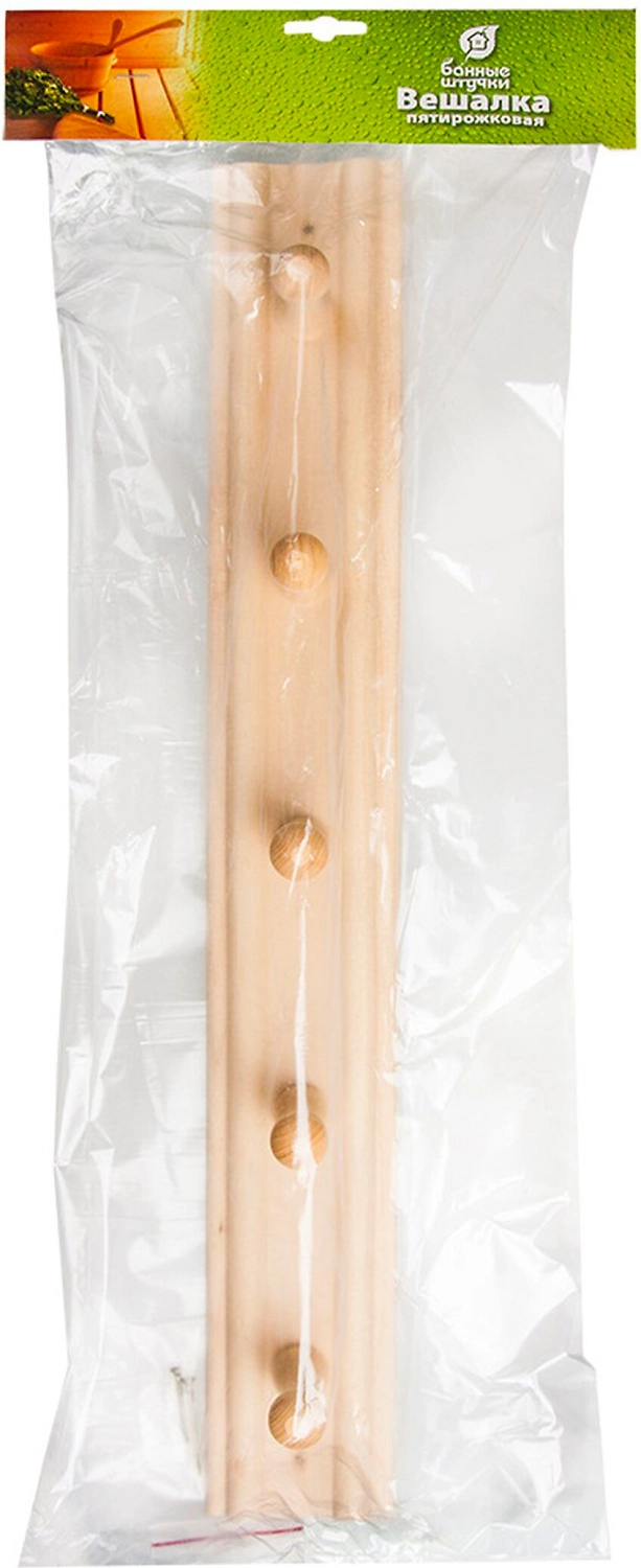 Вешалка от производителя "Банные штучки" поможет оборудовать помещение предбанника, парилки или раздевалки в бане. Изготовленная из липы, она имеет пять рожков. Благодаря такому количеству вешалок, можно компактно разместить на стене полотенца и одежду. Основным преимуществам аксессуара является то, что он не нагревается при высоких температурах. Это позволяет избегать травм от ожогов.
