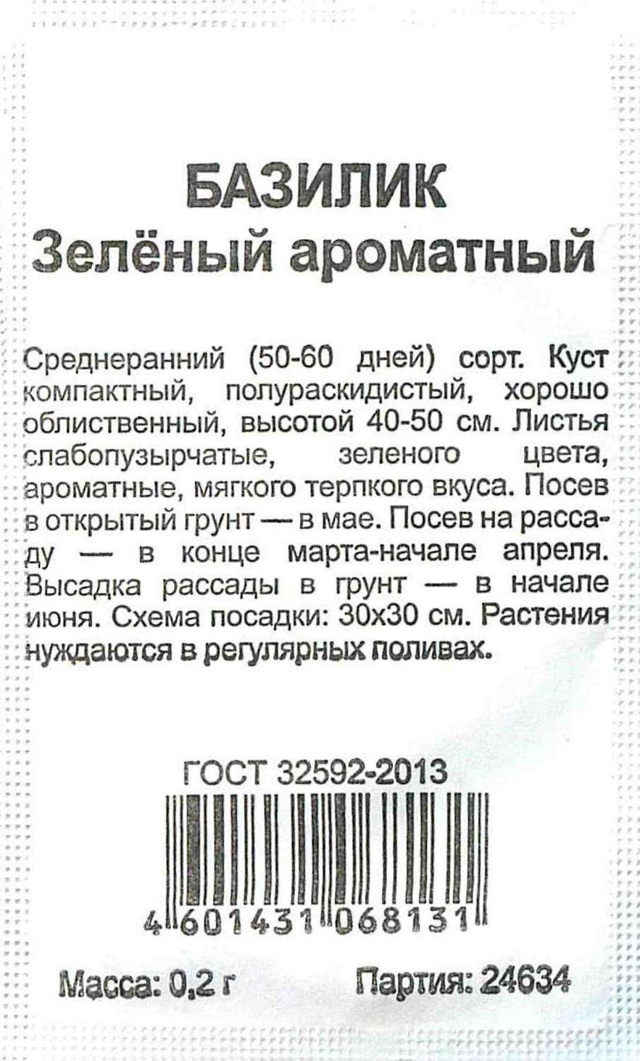Базилик Зеленый ароматный рекомендуется выращивать на хорошо освещенных участках с плодородной почвой. Для улучшения вкусовых качеств требуются регулярные поливы. Посев на рассаду можно осуществлять в конце марта-начале апреля, высадку в грунт - в начале июня, по схеме: 30х30 см. Семена в открытый грунт высеивают в мае.