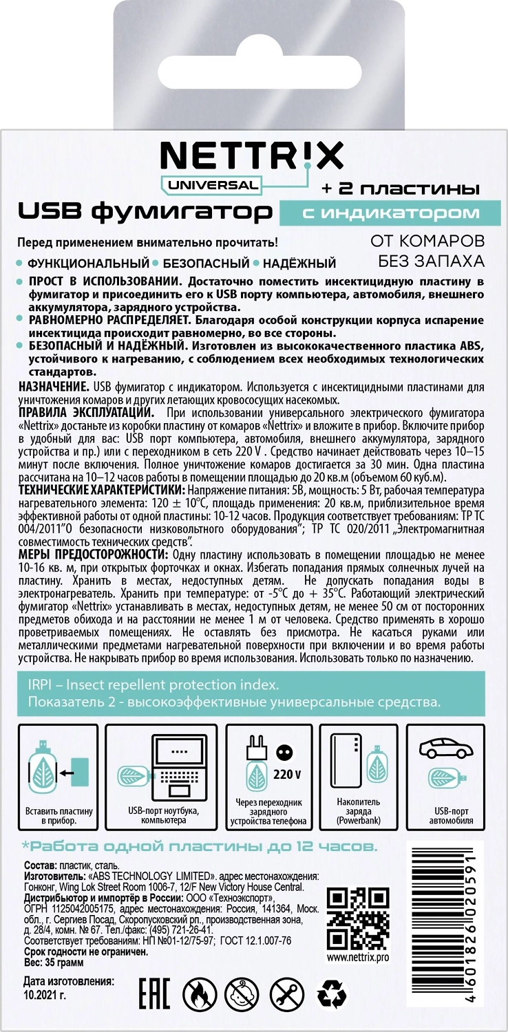 USB фумигатор с индикатором от комарав для пластин. +2 пластины в подарок. При использовании универсального электрического фумигатора "NETTRIX" достаньте пластину от комаров "NETTRIX" и вложите в прибор. Включите прибор в удобный для вас USB порт ( компьютера, автомобиля , внешнего аккумулятора, зарядного устройства и пр.) или с переходником в сеть 222V. Средство начинает действовать через 10-15 минут после включения. Полное уничтожение комаров достигается за 30 минутю Одна пластина расчитана на 10-12 часов работы в помещении площадью до 20 кв.м. (объемом 60 куб.м.)