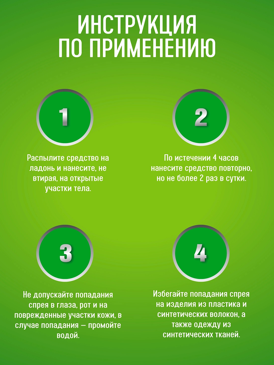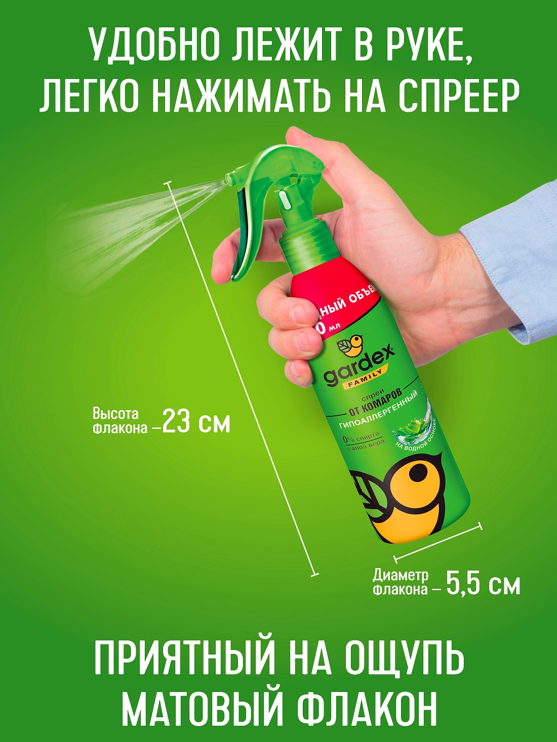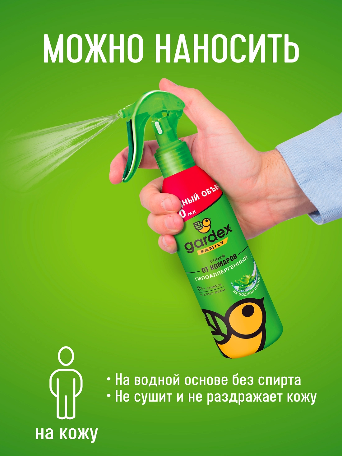 Можно наносить на кожу и на одежду, не оставляет жирных следов пятен. 0 процентов спирта в составе средства. Увлажняет и смягчает кожу благодаря наличию Алоэ Вера в составе спрея. Выгодный объем флакона - оптимально для всей семьи.