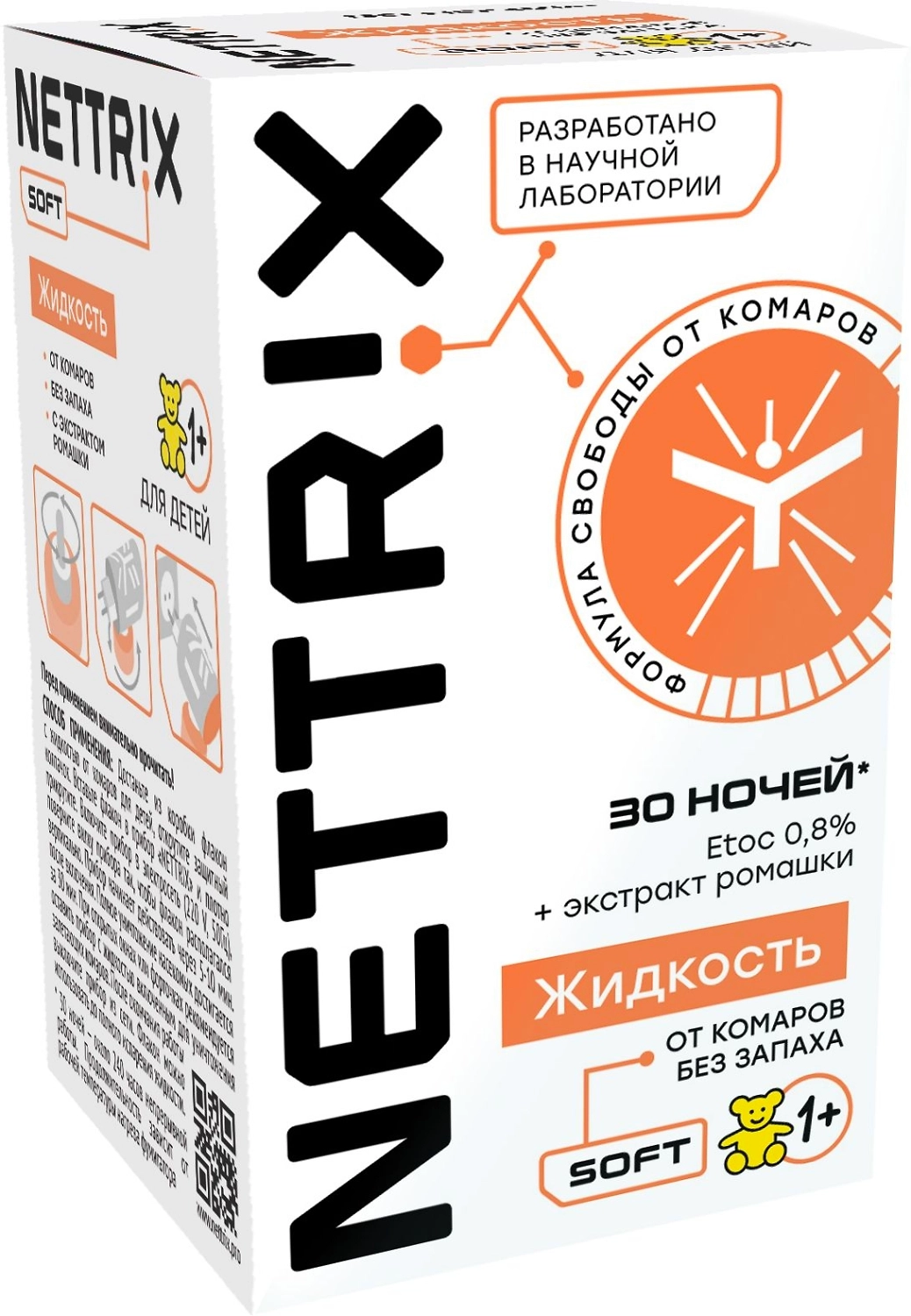NETTRIX Soft Жидкость от комаров на 30 ночей ( около 240 часов непрерывной работы) для детей. Достаньте из коробки флакон с жидкостью от комаров, открутите защитный колпачок. Вставьте флакон в прибор "NETTRIX" и плотно прикрутите. Включите прибор в электросеть (220 V, 50 Гц), поверните вилку прибора так, чтобы флакон располагался вертикально. Прибор начинает действовать через 5-10 минут после включения. Полное уничтожение насекомых достигается за 30 минут. При открытых окнах или форточках рекомендуется оставить прибор с жидкостью включенным на всю ночь для уничтожения залетающих комаров. После окончания работы прибора выключите прибор из сети. Флакон можно использовать до полного испарения жидкости.