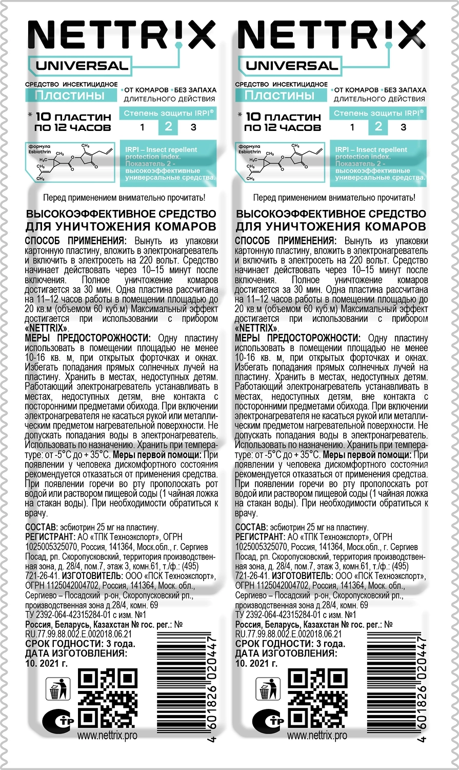 Пластины от комаров без запаха. Время действия одной пластины 12 часов в помещении площадью 20 кв.м. Вынуть из упаковки картонную пластину, вложить в электронагреватель и включить в электросеть на 220 вольт. Средство начинает действовать через 10-15 минут после включения. Полное уничтожение комаров достигается за 30 мин. Одна пластина расчитана на 10-12 часов работы в помещении площадью 20 кв.м. Максимальный эффект достигается при использовании с прибором "NETTRIX".