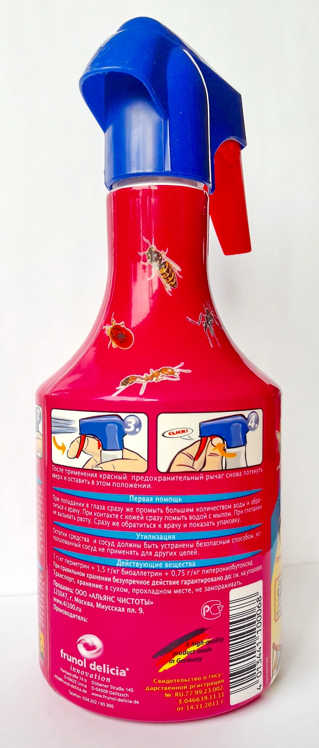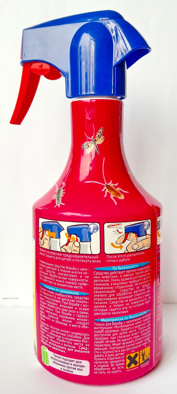 Универсальное профессиональное средство против летающих и ползающих насекомых (мух, комаров, мошки,блох, мокриц, тараканов, клещей, одежной моли, муравьев, клопов и др.)Средство действуетбыстро и надежно, основано на новейшей современной разработке формулы действующего вещества. Действует как контактное средство. Долговременный эффект: срок действия средства несколько недель! Средство не содержит газ-носитель, практически без запаха и при правильном использовании не представляет опасности человеку и домашним животным. Контра инсект не агрессивно и не разрушает поверхности, на которые наносится.