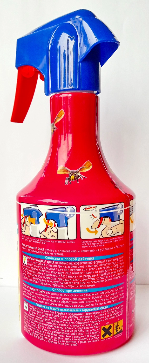 Высокоэффективный препарат специально разработан для мгновенного уничтожения всех видов ос, шершней, пчел и других вредных перепончатокрылых и их потомства. Delicia.Wespex.Quick основано на эффективной формуле действующих веществ, состоящей из перметрина, эсбиотрина и пиперонилбутоксида. Оно успешно и быстро действует уже при первом контакте с насекомыми. Сверх того остаточный эффект действия защищает еще многие недели от нашествия насекомых. Средство так же превосходно действует против других летающих (мухи, комары) и ползающих (муравьи, тараканы, мокрицы) насекомых. Средство не агрессивно, практически без запаха и не разрушает обработанные поверхности. При правильном использовании средство безвредно для человека и домашних животных.