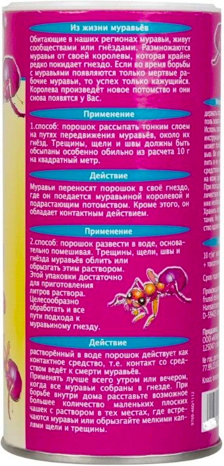 Порошок развести в воде, основательно помешивая. Трещины, щели, швы и гнезда муравьев облить или обрызгать этим раствором. Этой упаковки достаточно для приготовления 25 литров раствора. Целесообразно обработать и все пути подхода к муравьиному гнезду. Применять лучше всего утром или вечером, когда все муравьи собраны в гнезде. При борьбе внутри дома расставьте маленькие плоские чашки с раствором в тех местах, где встречаются муравьи или обрызгайте мелкими каплями щели и трещины.