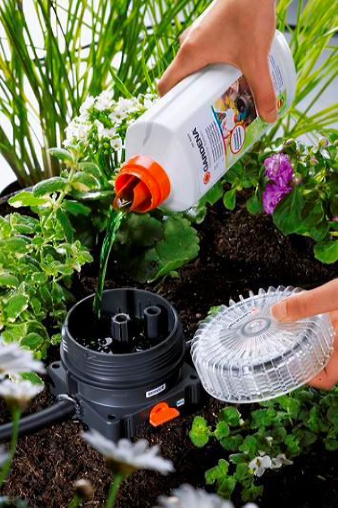 Дозатор для удобрений GARDENA идеально подходит для внесения универсального жидкого удобрения GARDENA и использования вместе с системой микрокапельного полива GARDENA Micro-Drip-System.
