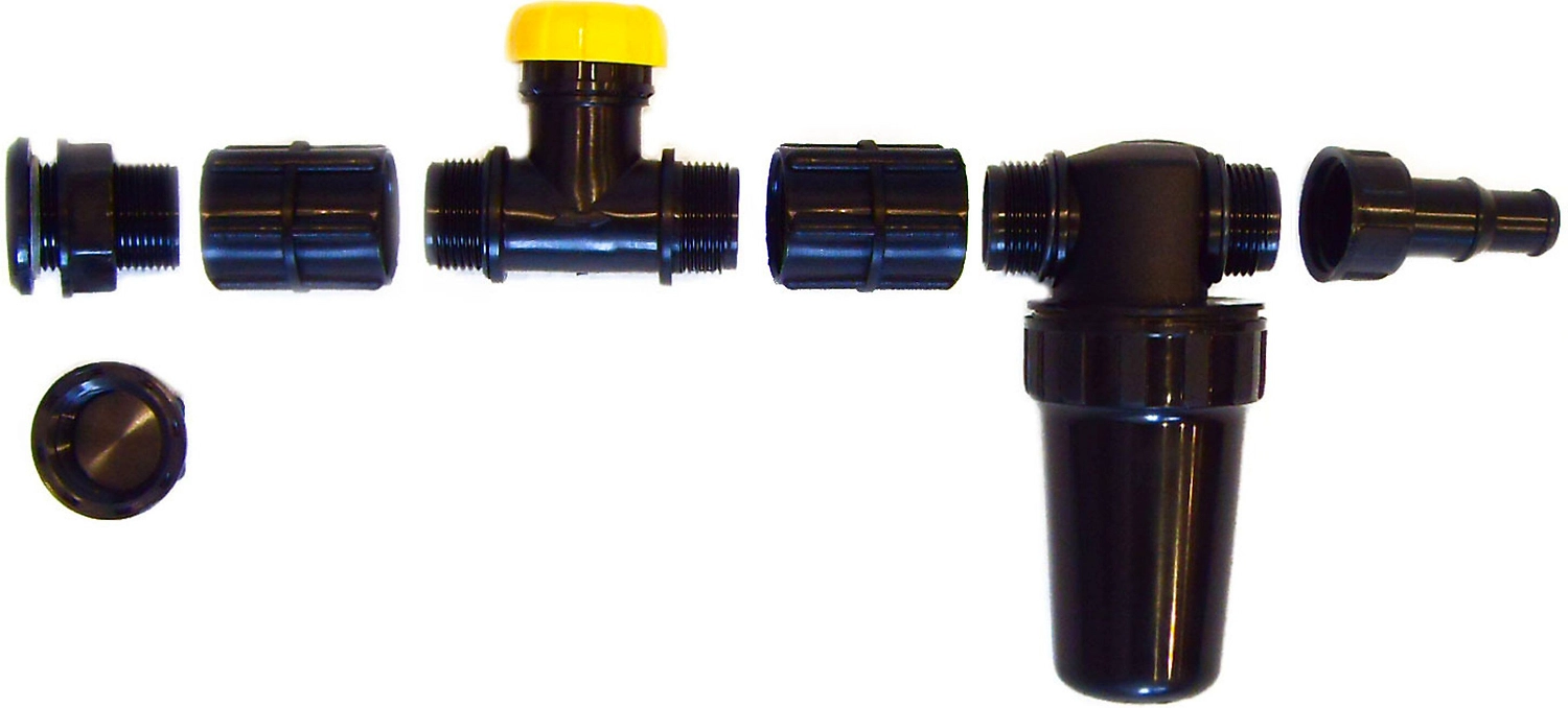 Комплект включает в себя несколько элементов: 1 штуцер для врезания в емкость, 2 муфты, 1 кран, 1 фильтр тонкой очистки воды, штуцеры к шлангу 1/2-3/4. Система отличается легкостью монтажа и установки, надежна и безопасна в эксплуатации.