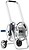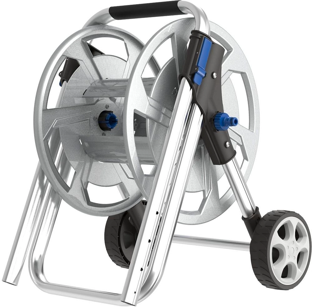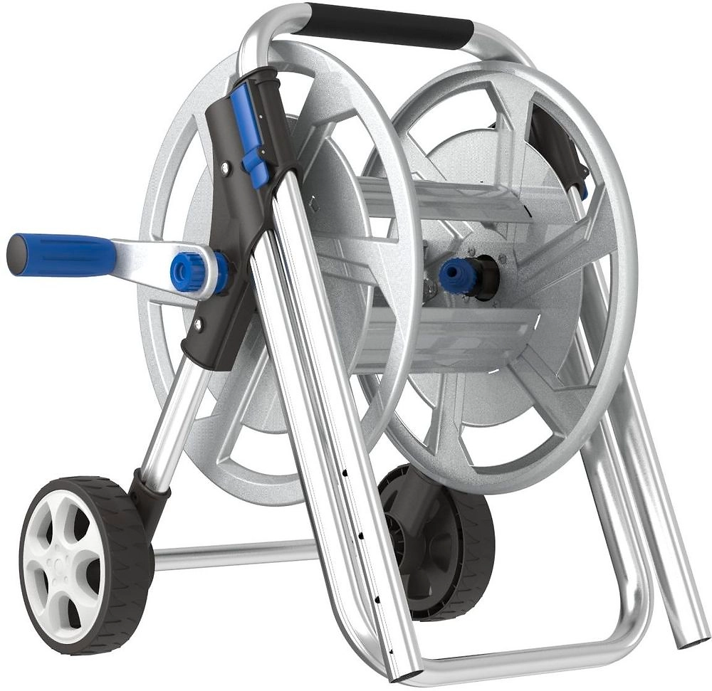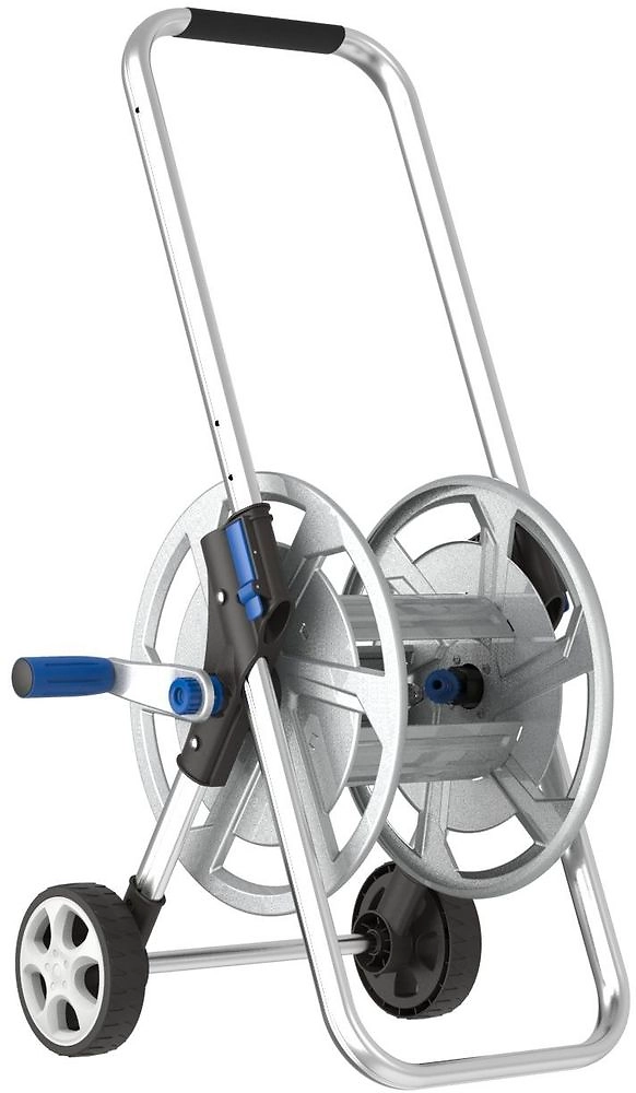 Тележка для шланга выполнена из металла, в серебристом оттенке. Металлическая конструкция отличается прекрасными прочностными и износостойкими характеристиками.