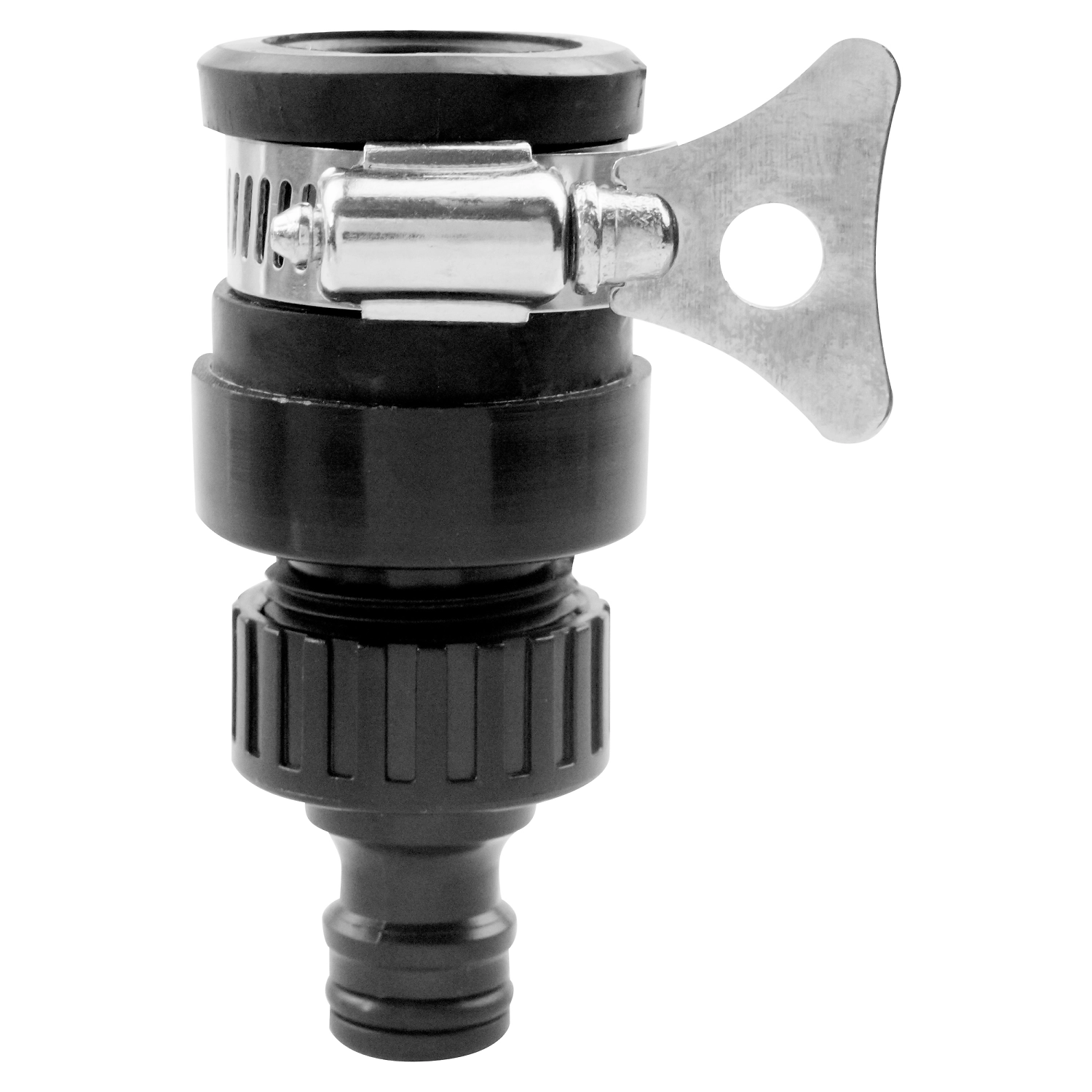 Коннектор используется на безрезьбовых кранах и позволяет подсоединять поливочный шланг к центральной системе подачи воды. Данное приспособление позволяет легко создать герметичное муфтовое соединение. Соединитель изготовлен из прочного пластика, место крепления к крану затягивается металлическим хомутом, кроме того, такое соединение отличается универсальностью и удобной эксплуатацией.