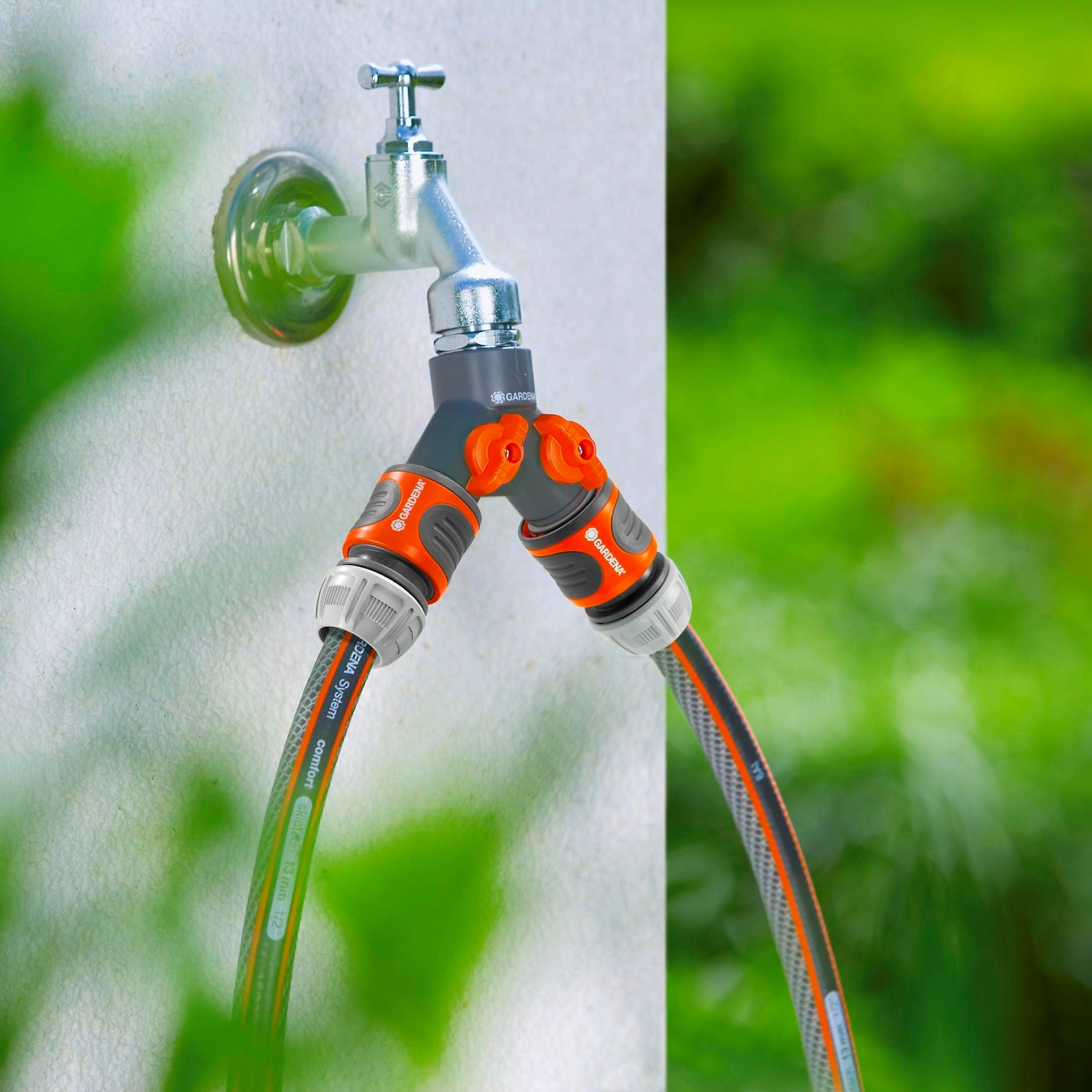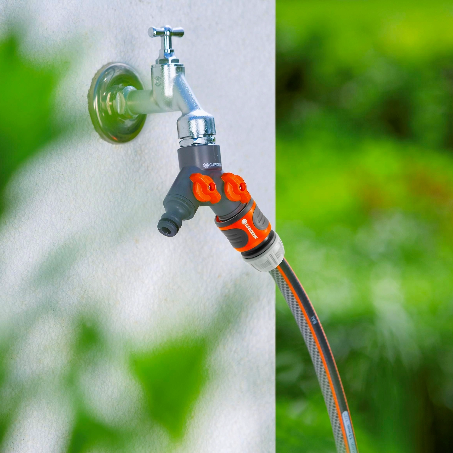 Распределитель 2-х канальный GARDENA позволяет одновременно использовать два поливочных инструмента, благодаря чему пользователю не приходится менять подсоединяемые к крану шланги.