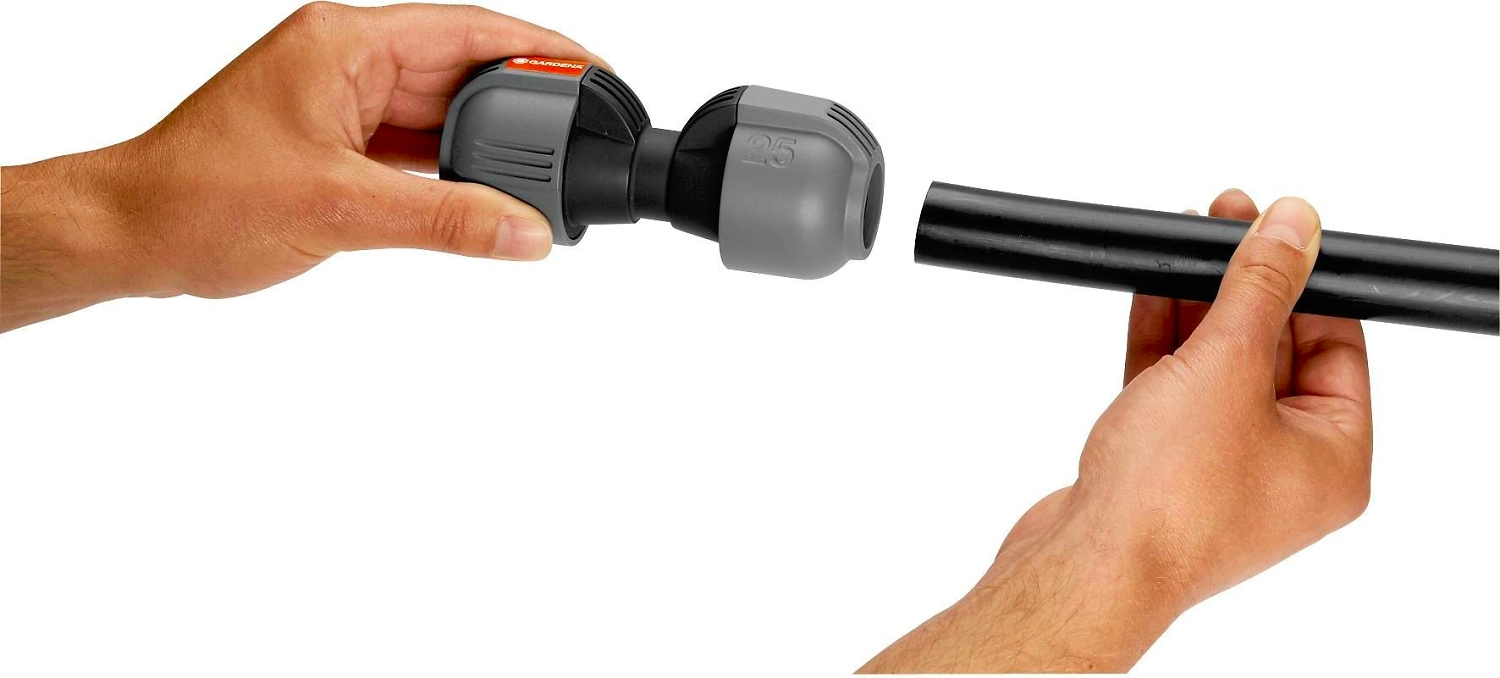 Соединитель GARDENA 25 мм, входящий в систему дождевания GARDENA Sprinklersystem, используется для наращивания подающего шланга.