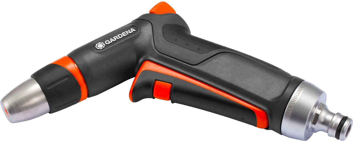 Пистолет-наконечник с плавной регулировкой **Gardena Premium** одинаково подходит как для очистки, так и для полива. Струя воды может регулироваться от жесткой струи до мелкодисперсного тумана. Элементы из мягкого пластика на распылителе обеспечивают защиту от повреждений. Металлические детали корпуса и штуцер для исключительной надежности. Эргономичная ручка с мягкими пластиковыми компонентами обеспечивает оптимальный комфорт во время работы. Расход воды можно плавно регулировать одной рукой. Фиксатор кнопки включения для непрерывного орошения чтобы не утомлять руку. Дополнительно оснащен защитой от мороза.