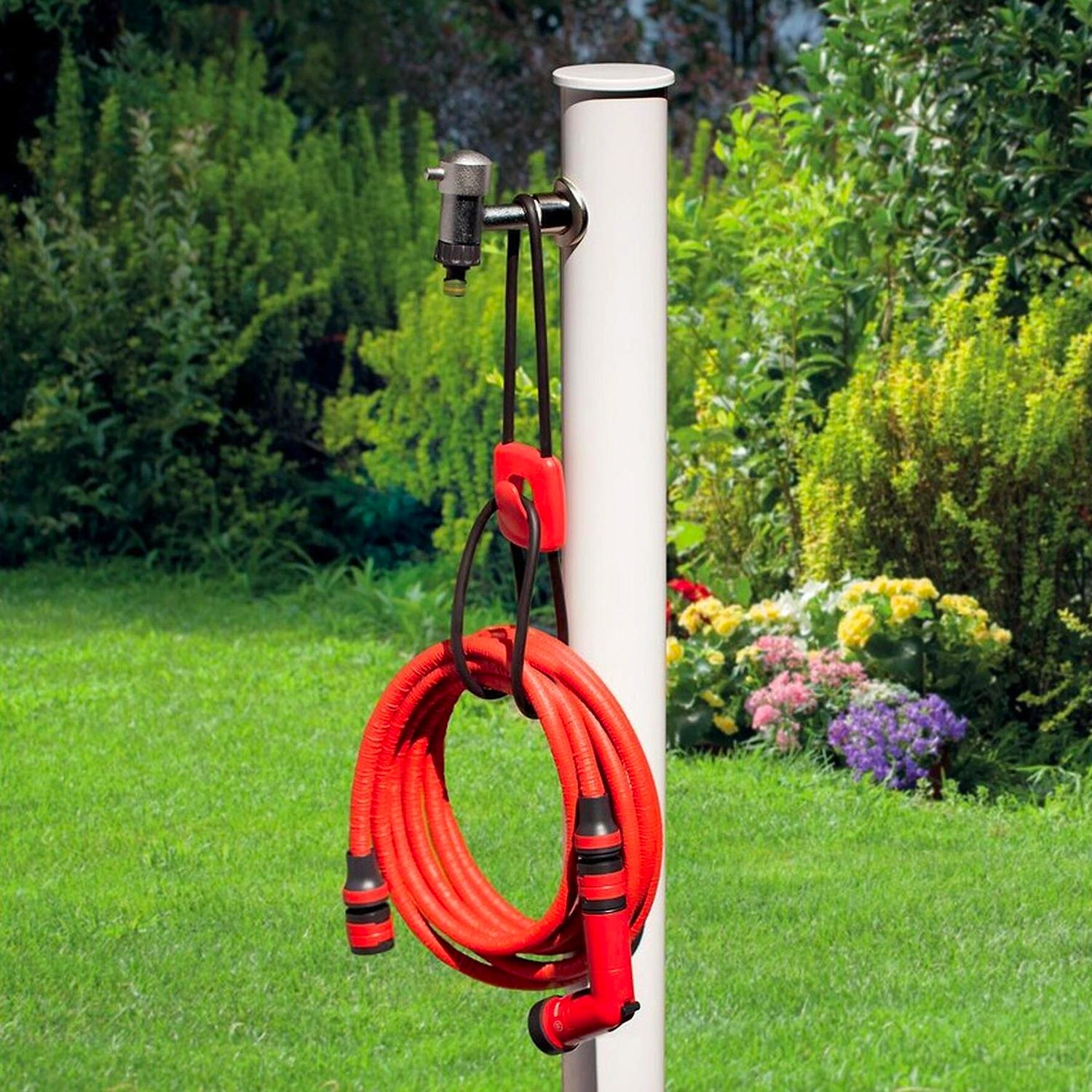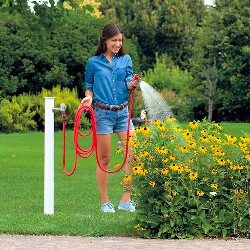 - Благодаря ярко-красной расцветке шланг не теряется среди зелени в саду.