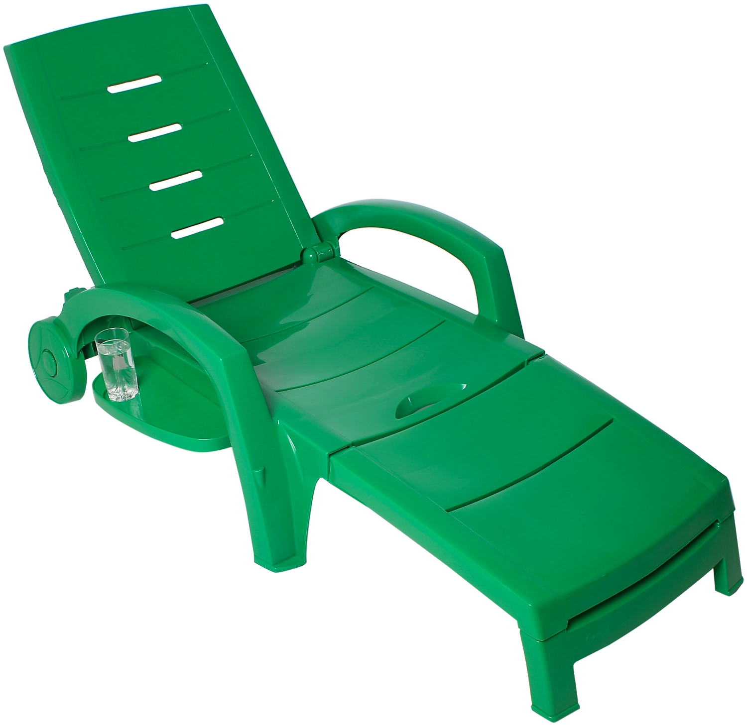 Пластиковый шезлонг - раздвижное кресло, в котором можно расположиться полулежа. Габариты рассчитаны на комфортный отдых человека средней комплекции. В конструкции предусмотрены столик с подставкой для напитков и вместительный ящик для хранения.