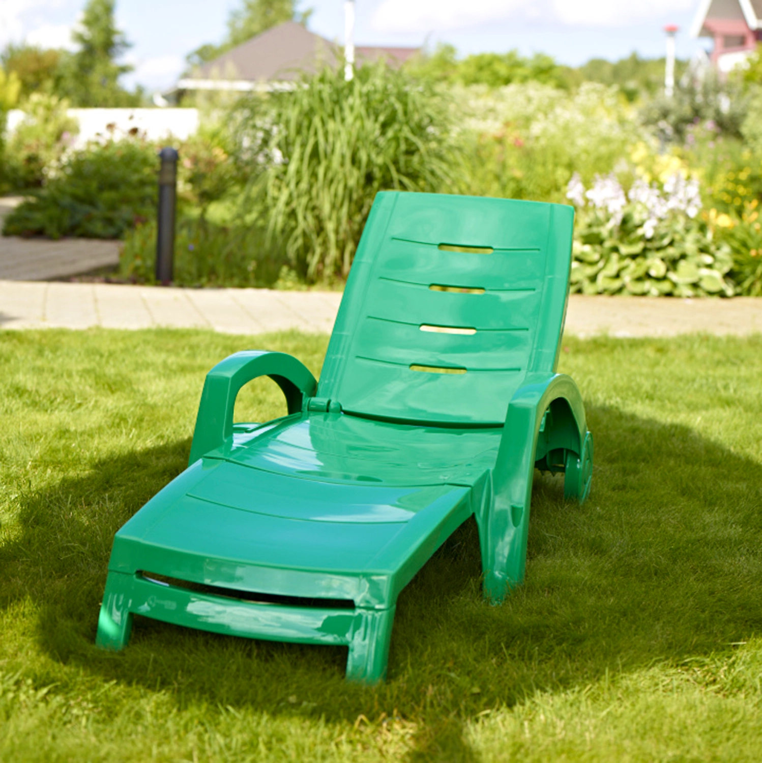 Пластиковый шезлонг устанавливается в саду, около бассейна на даче или во дворе частного дома, подходит для сауны и бани, спа салонов, турбаз и спортивных объектов.