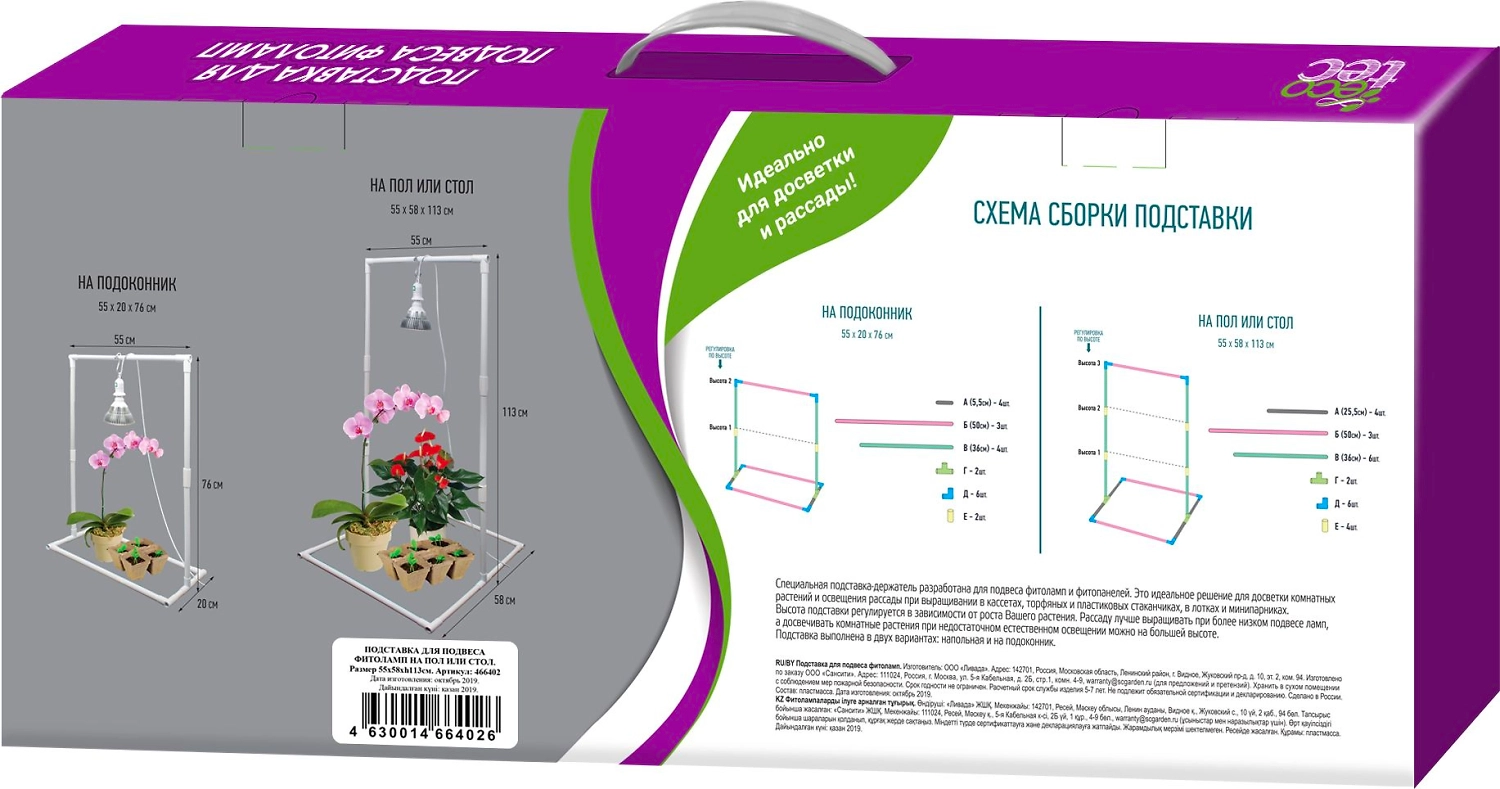 Пластиковая подставка (напольная) для фитолампы. Предназначена для создания оптимальных условий для освещения рассады, комнатных растений. Устанавливается на пол, высота составляет 76 см, габаритные размеры 55х58 см.Для изготовления подставки используется высококачественный, прочный и надежный пластик. Стойка легко собирается и разбирается, ее можно транспортировать в любую удобную точку. Подставка многоразового использования, имеет удобное крепление для подвешивания фитолампы, занимает мало места, подходит даже для малогабаритных помещений.