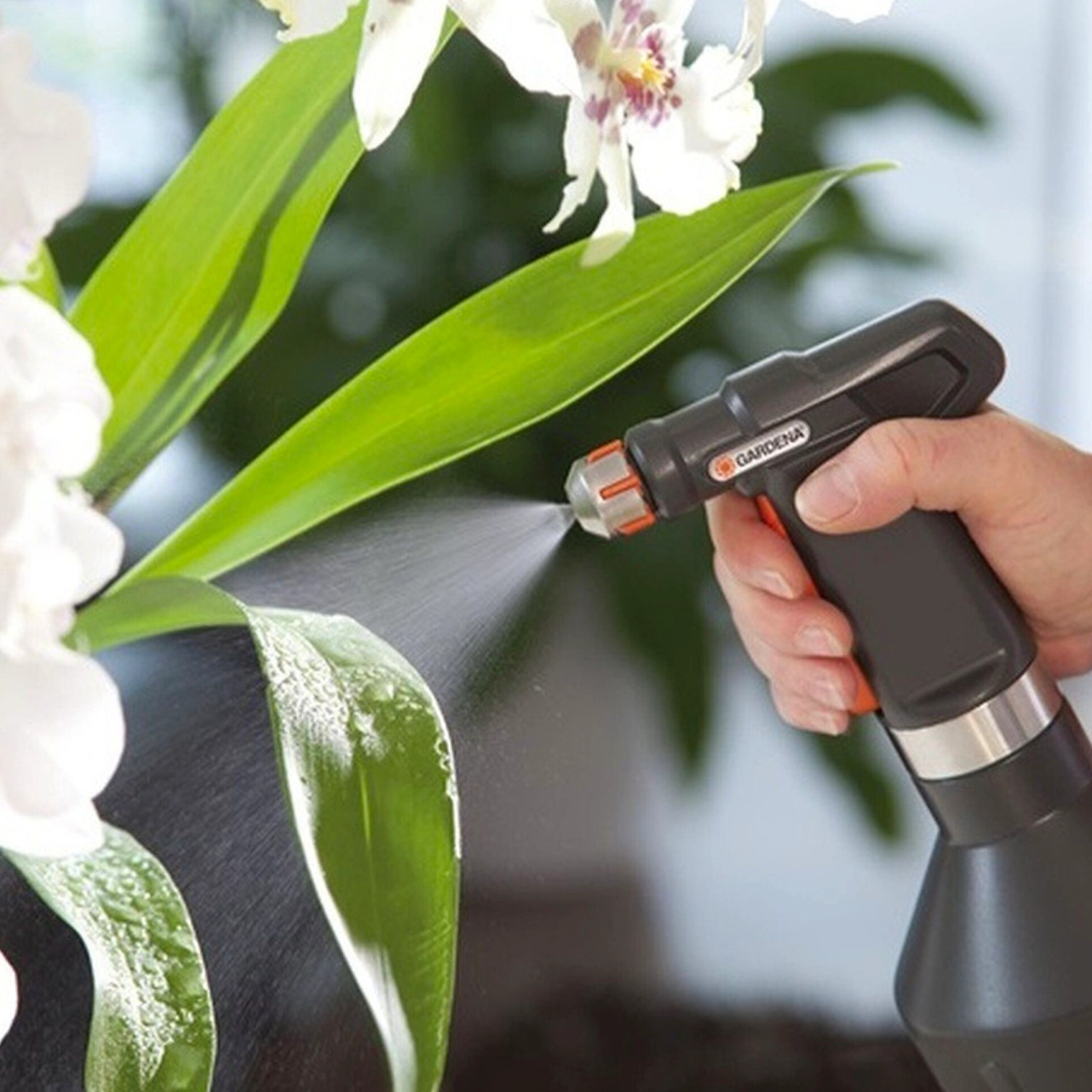 Ручной опрыскиватель торговой марки Gardena используется для верхнего орошения растений.