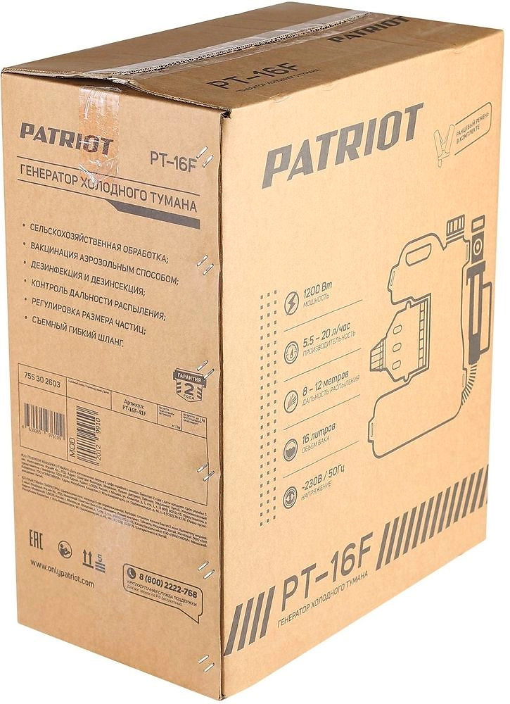Генератор холодного тумана PATRIOT PT-16F предназначен для обработки распыленными веществами офисов, складов, ферм, садовых участков, транспортных средств и т.д.