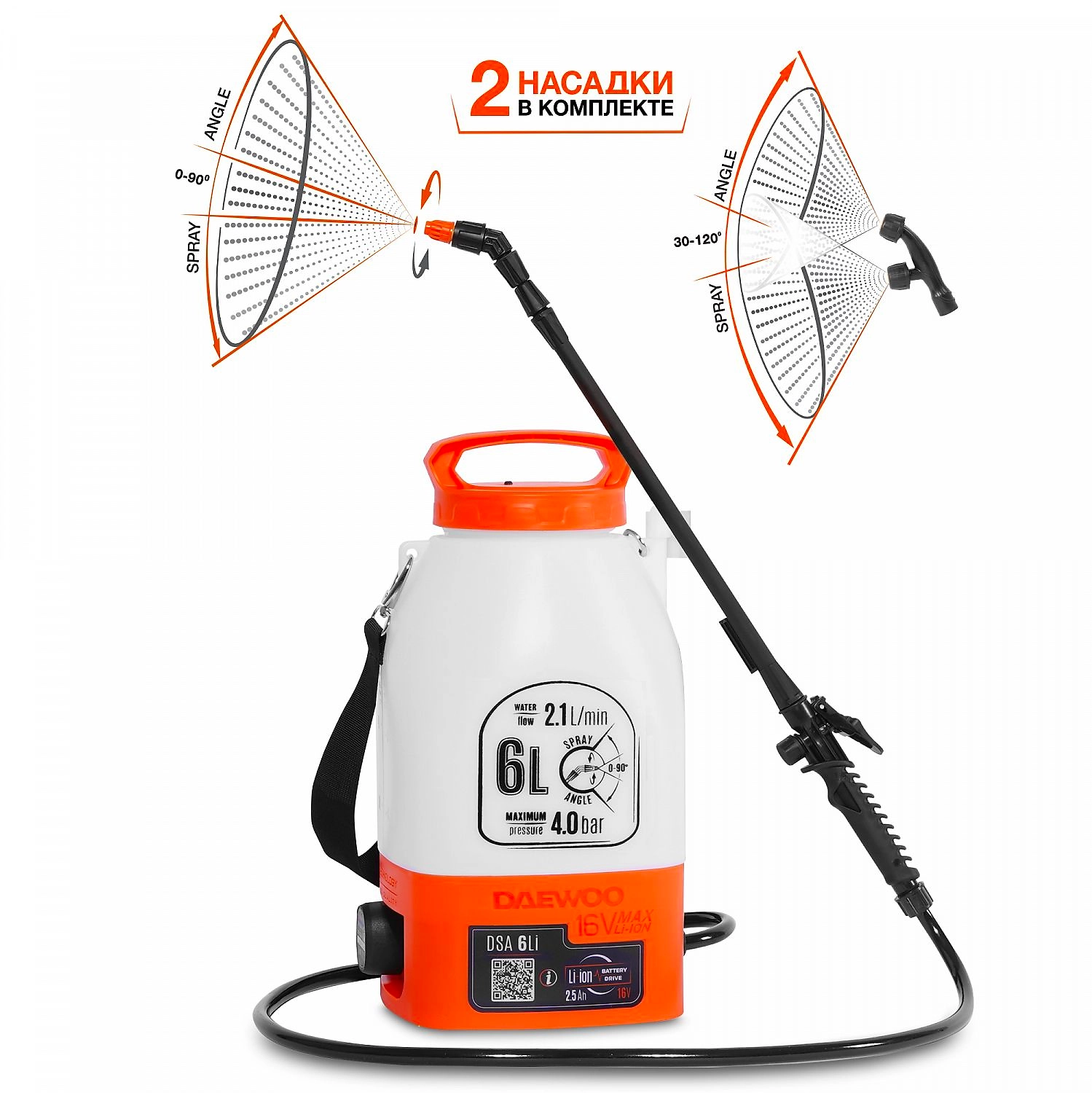 6 литров, 4 бар, 2,1 л/мин, аккумулятор: 16В, Li-Ion, 2,5 Ач, ремень на плечо, 2 шт. насадок, Вес: 2.9 кг
