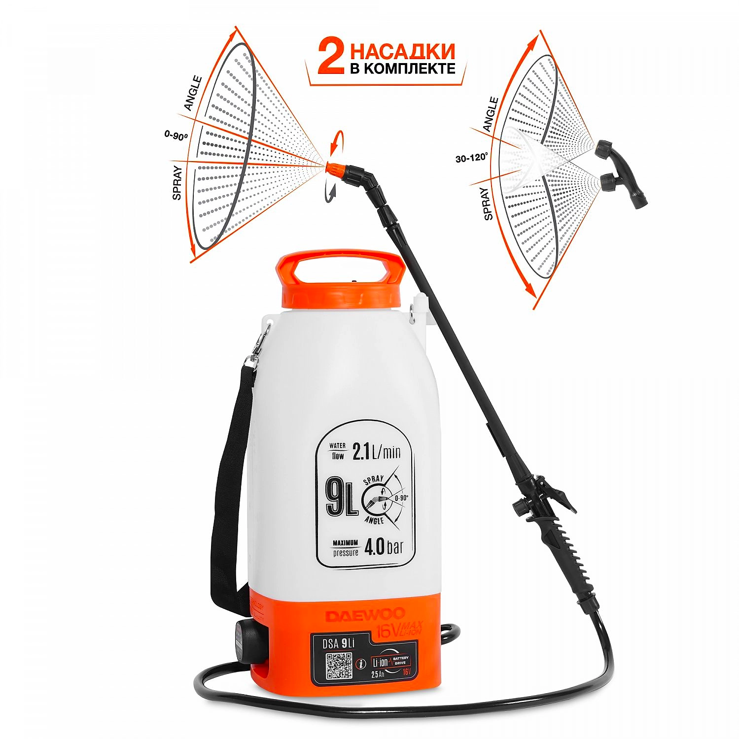 9 литров, 4 бар, 2,1 л/мин, аккумулятор: 16В, Li-Ion, 2,5 Ач, ремень на плечо, 2 шт. насадок, Вес: 3.1 кг