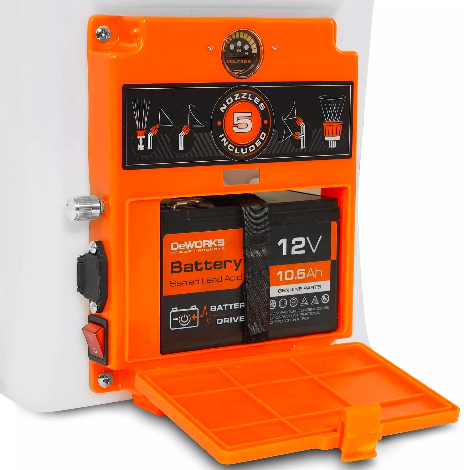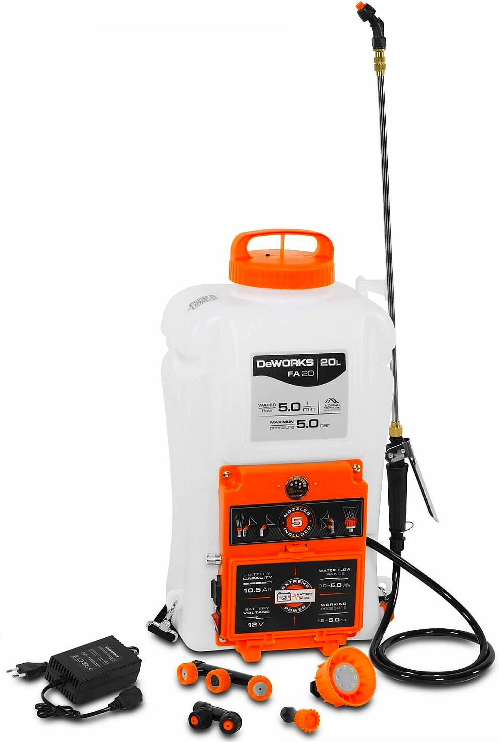 20 литров, 5 бар, 5,0 л/мин, аккумулятор: 12В, NiMh, 10,5 Ач, ремень на два плеча, 5 шт. насадок, Вес: 6.2 кг
