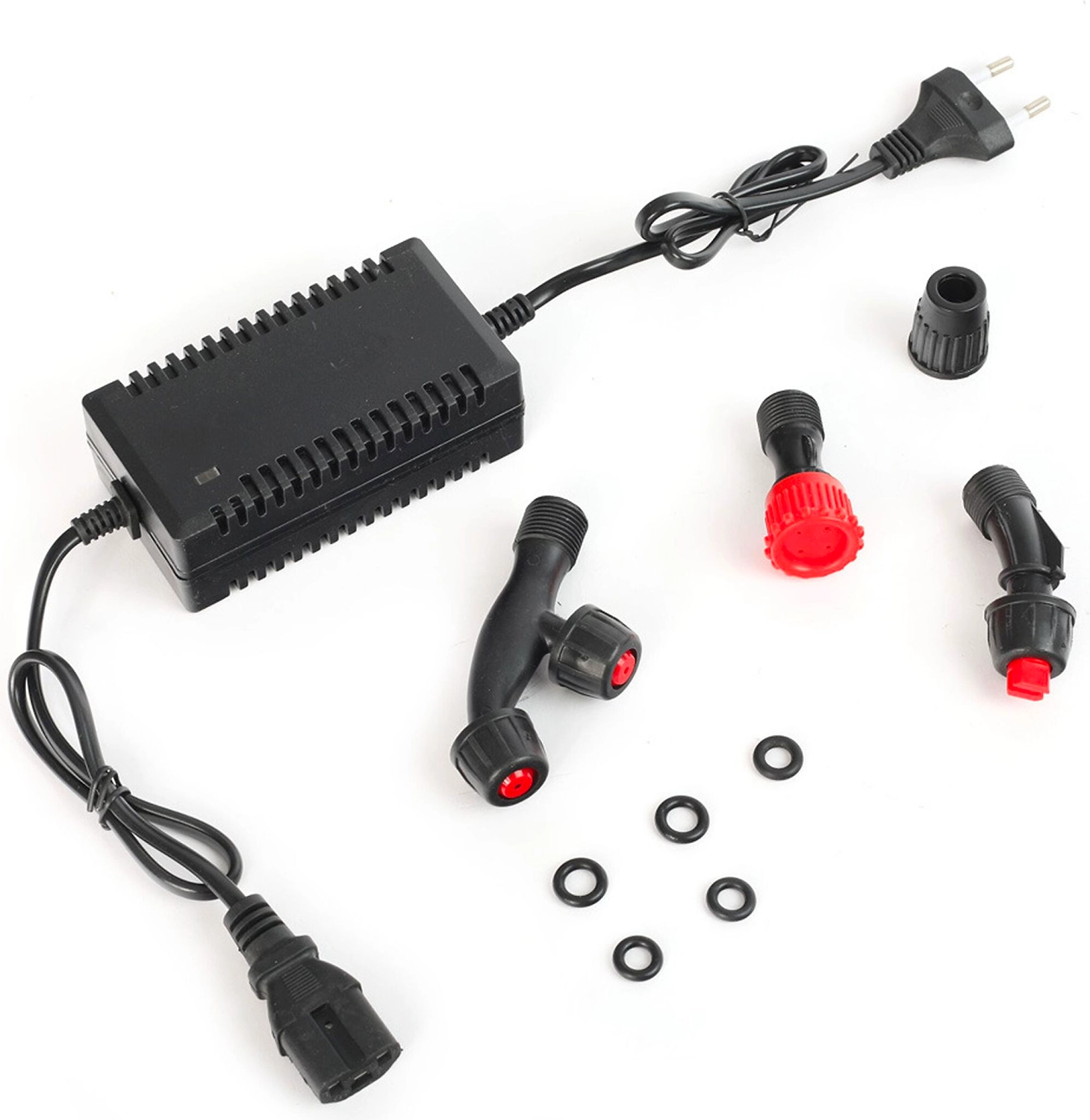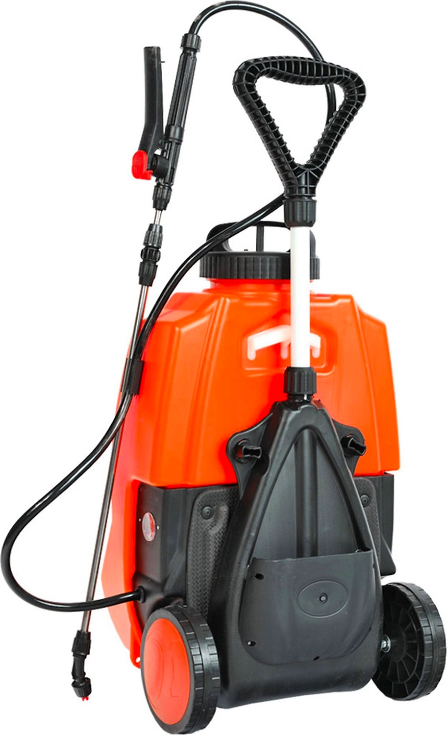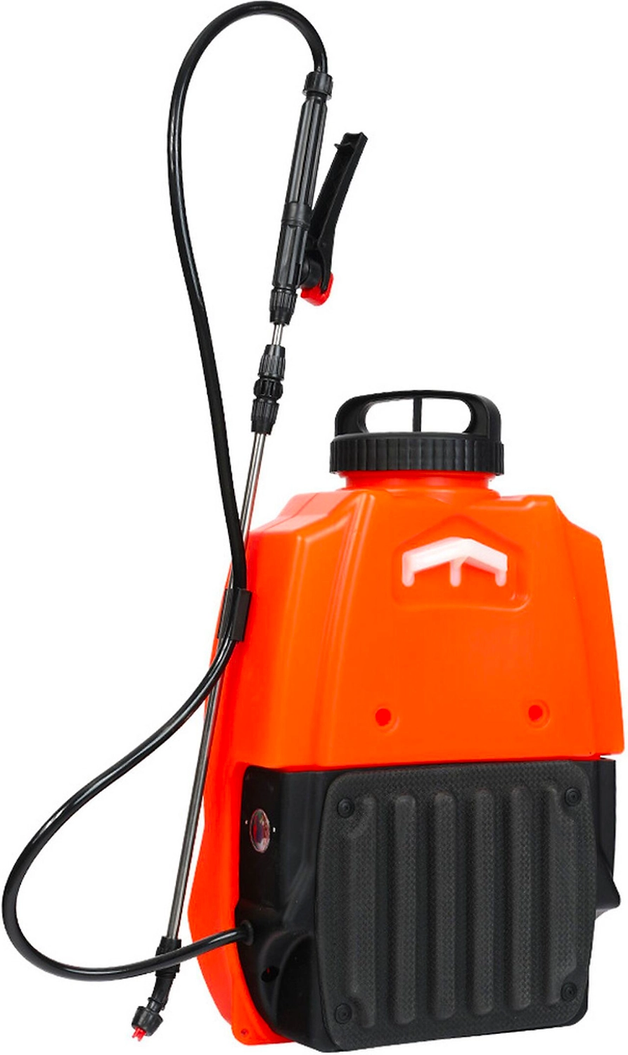 Данная модель опрыскивателя дополнительно оснащена легкой тележкой с колесами и отсеком для хранения насадок. Им можно работать как с земли, так и ранцевым методом - при помощи плечевого ремня. Опрыскиватель оборудован 16-литровым баком для жидкости. Функционирует от несъемного свинцово-кислотного аккумулятора 12 В, емкостью 8 Ач. В комплект входят насадки для равномерного распыления раствора. Предусмотрено ременное крепление для удобного ношения агрегата на спине. ЗУ и АКБ входят в комплект.