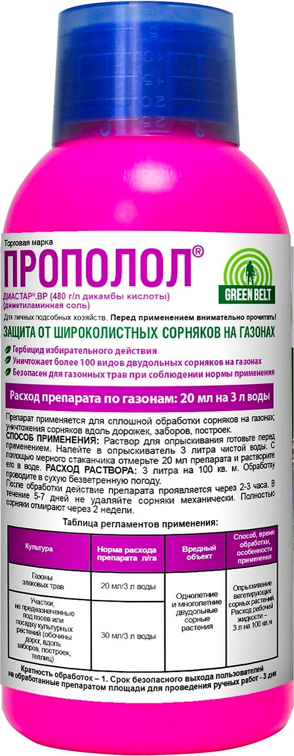 Гербицид избирательного действия GREEN BELT Прополол уничтожает сорную растительность на газонах, вдоль заборов, дорог, построек и теплиц. Средство эффективно против одуванчика, осота, конского щавеля, лопуха, подорожника и более 100 других видов двудольных широколистных сорняков. Препарат безопасен для газонных трав при соблюдении нормы применения.