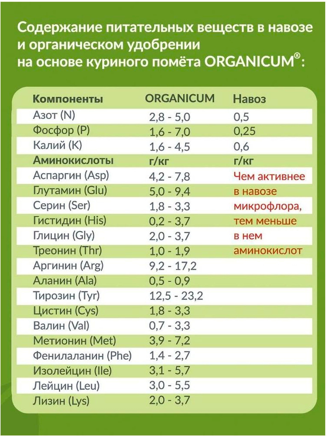 Комплексное концентрированное универсальное органическое удобрение нового поколения ORGANICUM содержит следующие полезные и питательные вещества: азот, фосфор, калий, аспаргин, глутамин, серин,