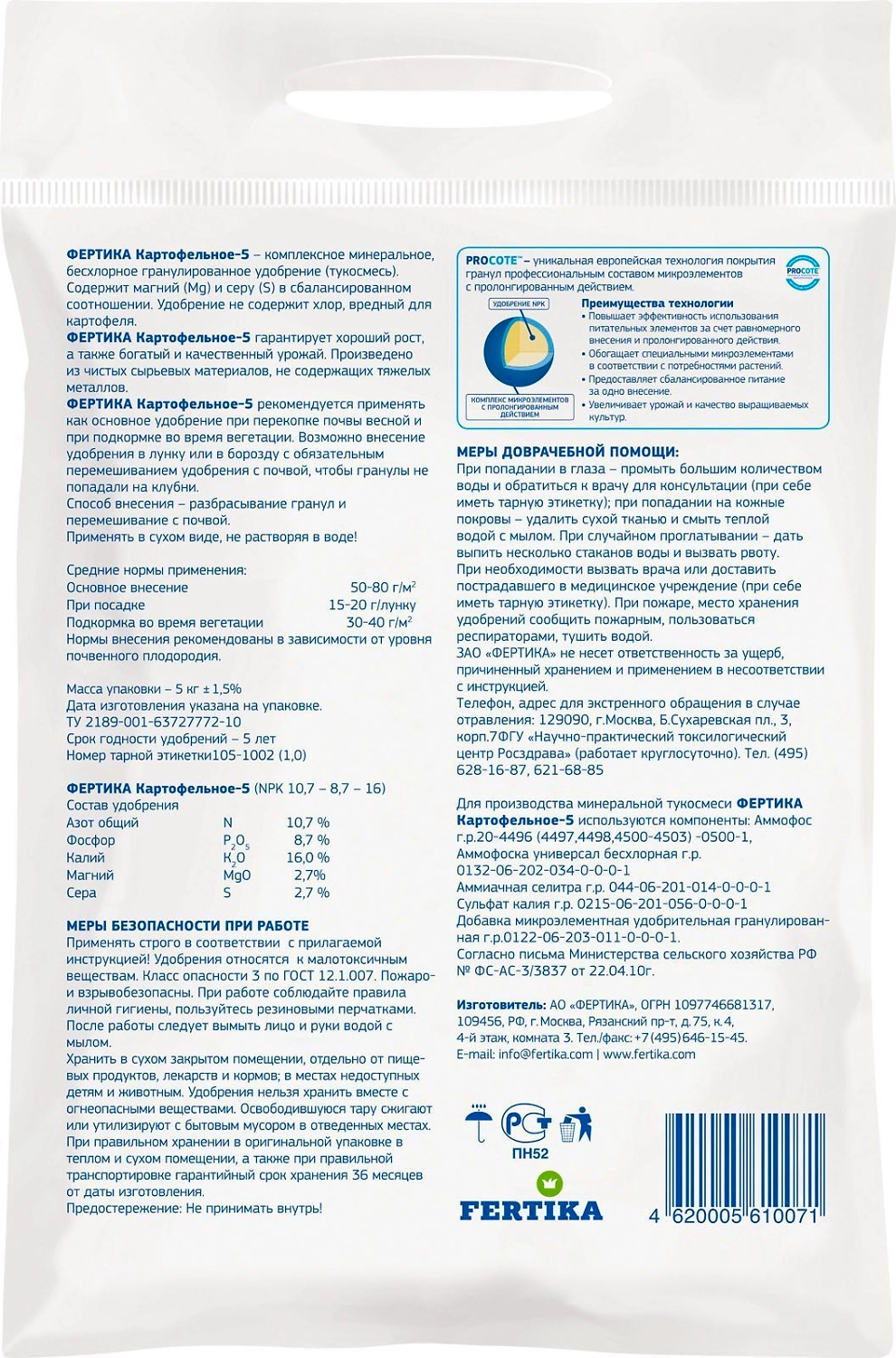 Удобрение FERTIKA Сад и огород Весна для картофеля - комплексная минеральная добавка пролонгированного действия, способствующая ускорению появления всходов и увеличению урожая.
