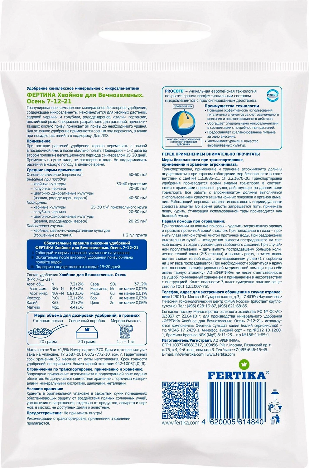 FERTIKA Хвойное - комплексное минеральное удобрение для подкормки вечнозеленых и голубики. Состав содержит азот, фосфор, калий, магний, серу, марганец, цинк и другие полезные микроэлементы, способствующие лучшему росту и развитию растений.