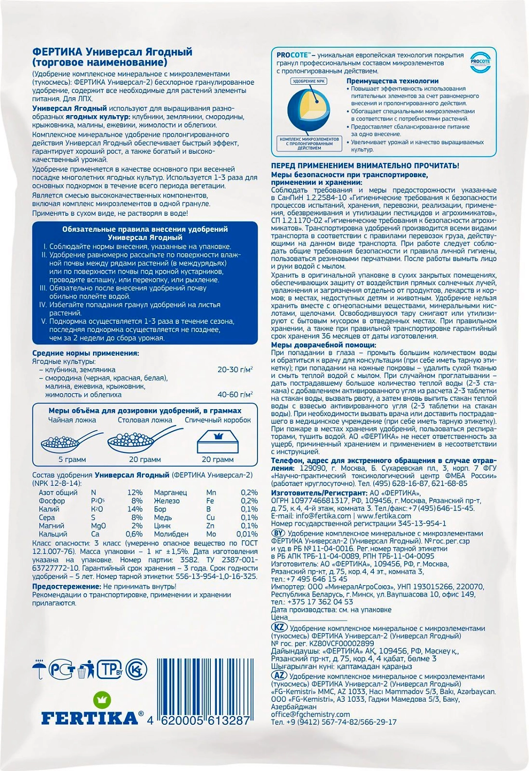 Удобрение комплексное минеральное с микроэлементами (тукосмесь) бесхлорное гранулированное удобрение, содержит все необходимые для растений элементы питания. Используют для выращивания разнообразных ягодных культур: клубники, земляники, смородины, крыжовника, малины, ежевики, жимолости и облепихи.Комплексное минеральное удобрение пролонгированного действия Универсал Ягодный обеспечивает быстрый эффект, гарантирует хороший рост, а также богатый и высококачественный урожай. является смесью высококачественных компонентов, включая комплекс микроэлементов в одной грануле.