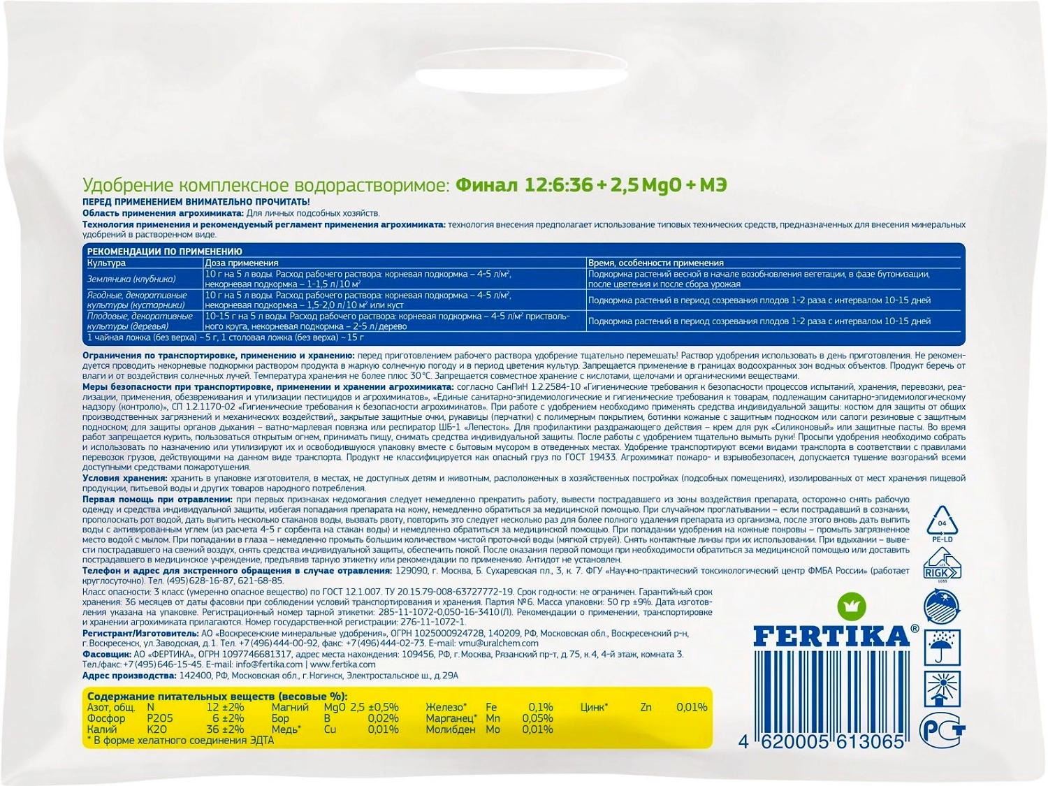 Полностью водорастворимое комплексное удобрение (NPK 12:6:36 + 2,5 MgO+МИКРОЭЛЕМЕНТЫ). Улучшает развитие соцветий, увеличивает завязываемость плодов. Повышает морозо- и засухоустойчивость растений, усиливает их рост. Повышает урожайность плодово-ягодных культур. Улучшает лежкость плодов.